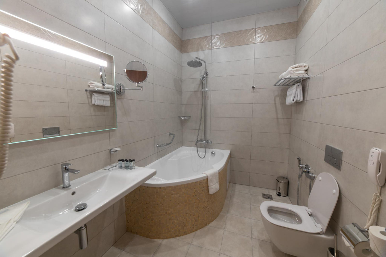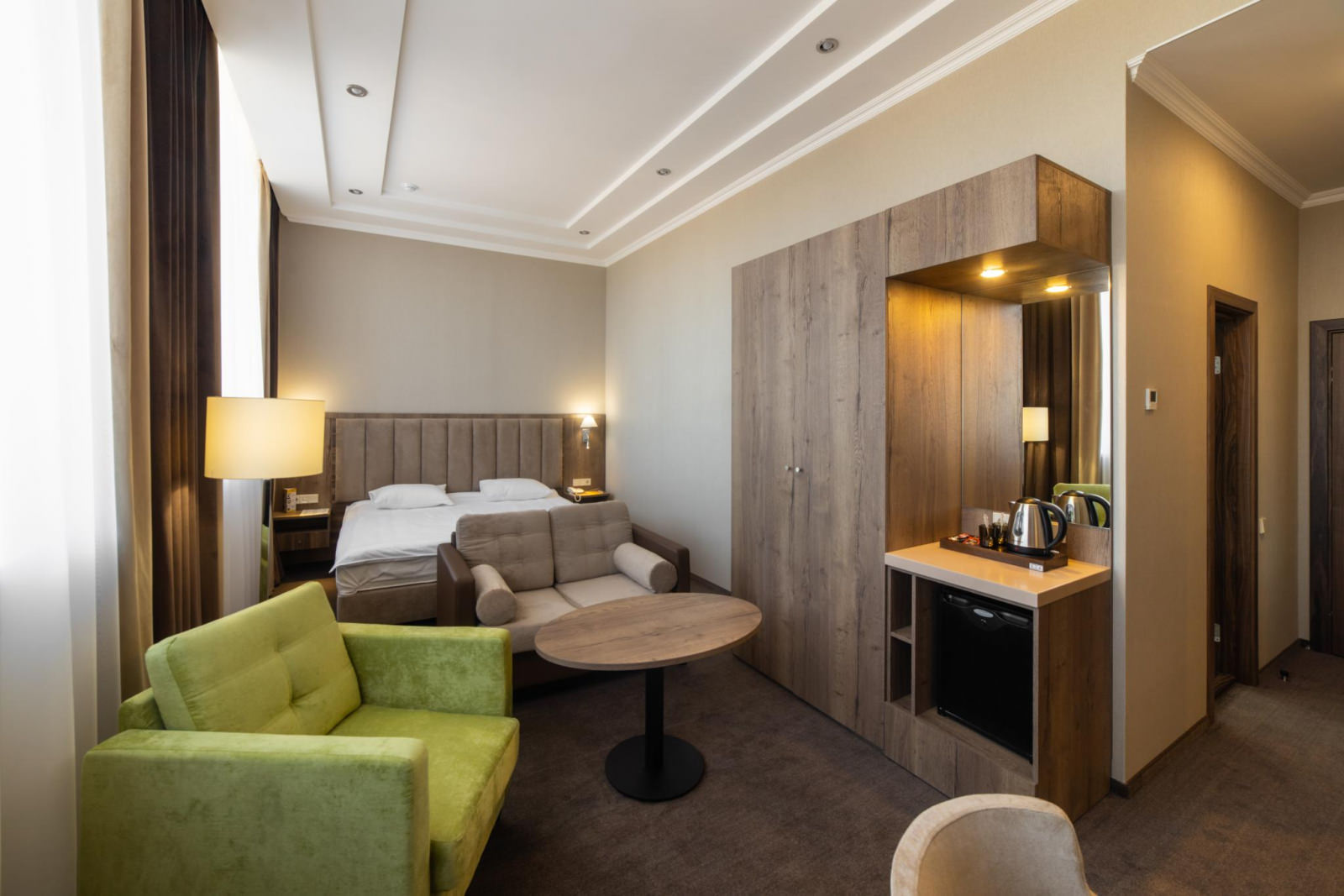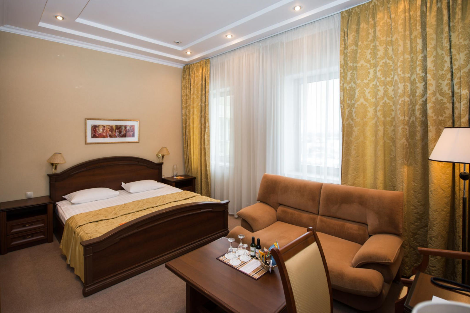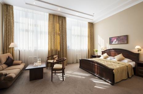 Площадь номера 29-35 кв.м., двуспальная кровать, стул, стол туалетный, прикроватные тумбочки, журнальный столик, 2 полукресла, раскладной диван, платяной шкаф, багажная полка, телефон, кабельное ТВ, доступ к Интернет (LAN), минибар, фэн-койл, сейф, в ванной комнате ванна, биде, фен, туалетные принадлежности.