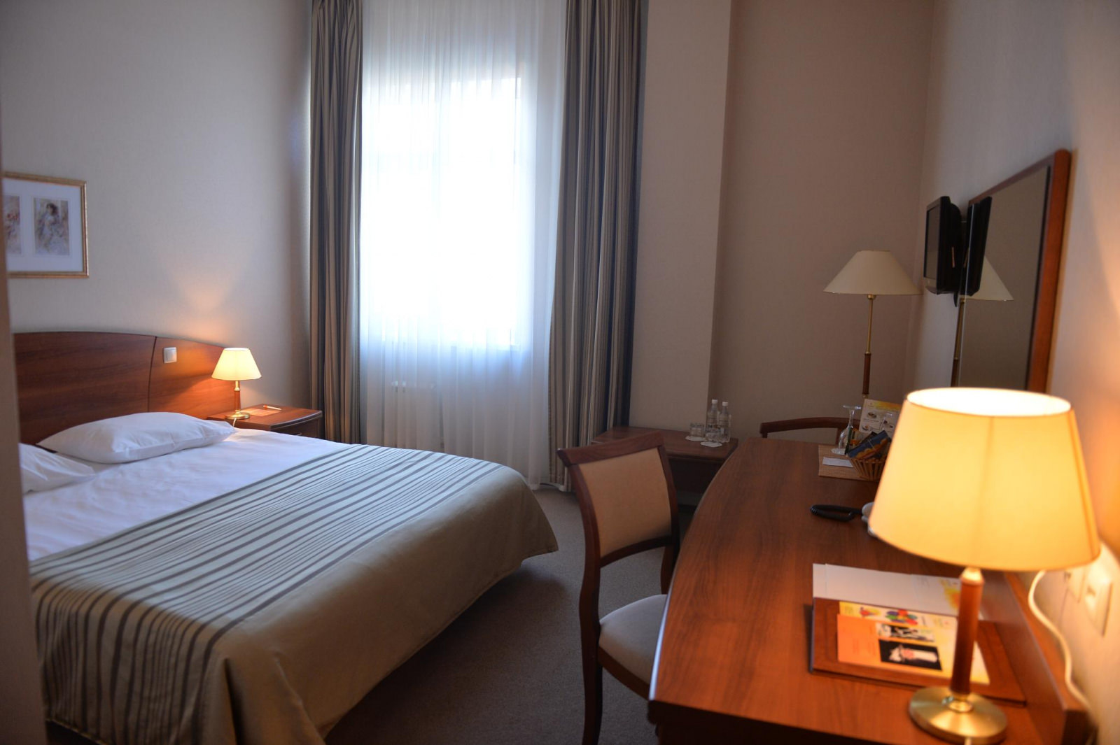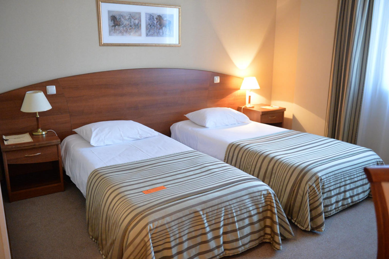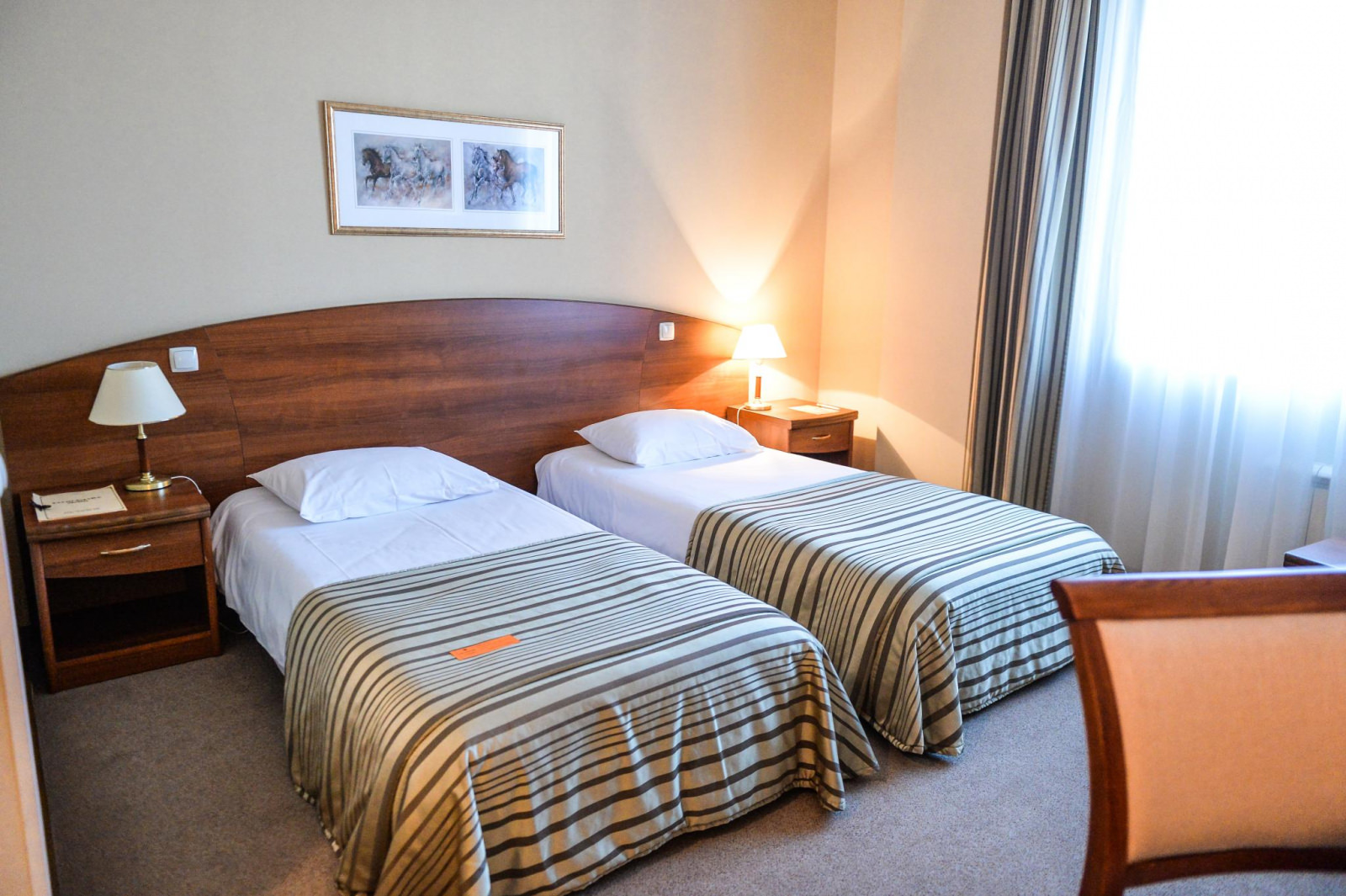 Площадь номера 21-25 кв.м., две односпальные кровати, прикроватные тумбочки, стул, стол рабочий, полукресло, журнальный столик, платяной шкаф, багажная полка, телефон, кабельное ТВ, доступ к Интернет (LAN), минибар, сейф, фэн-койл, в ванной комнате душ, фен, туалетные принадлежности.