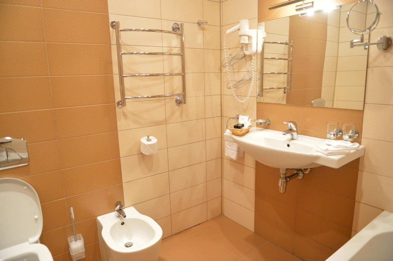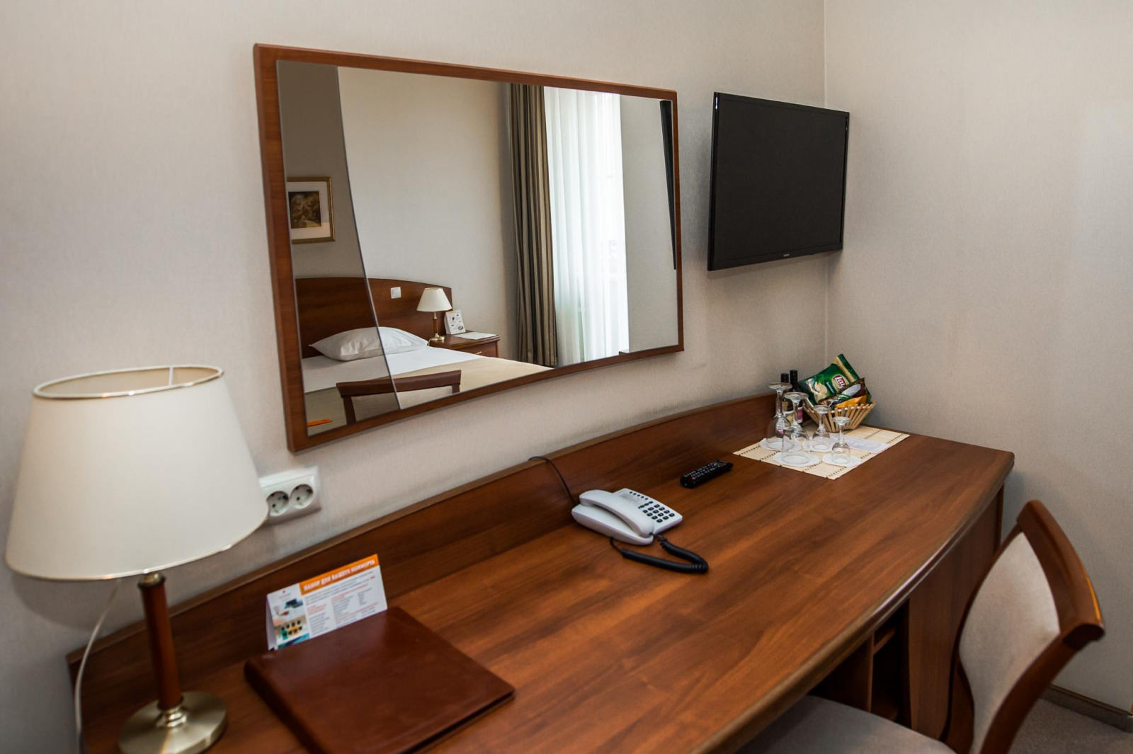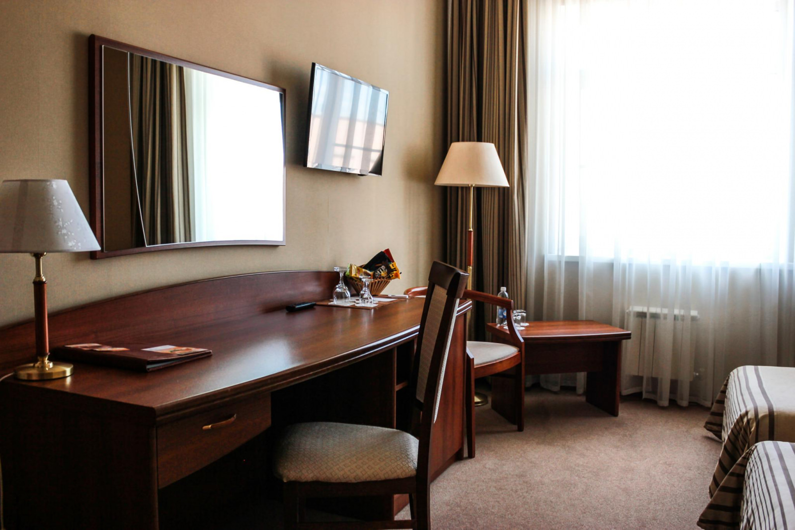 Площадь номера 21-25 кв.м., две односпальные кровати, прикроватные тумбочки, стул, стол рабочий, полукресло, журнальный столик, платяной шкаф, багажная полка, телефон, кабельное ТВ, доступ к Интернет (LAN), минибар, сейф, фэн-койл, в ванной комнате душ, фен, туалетные принадлежности.