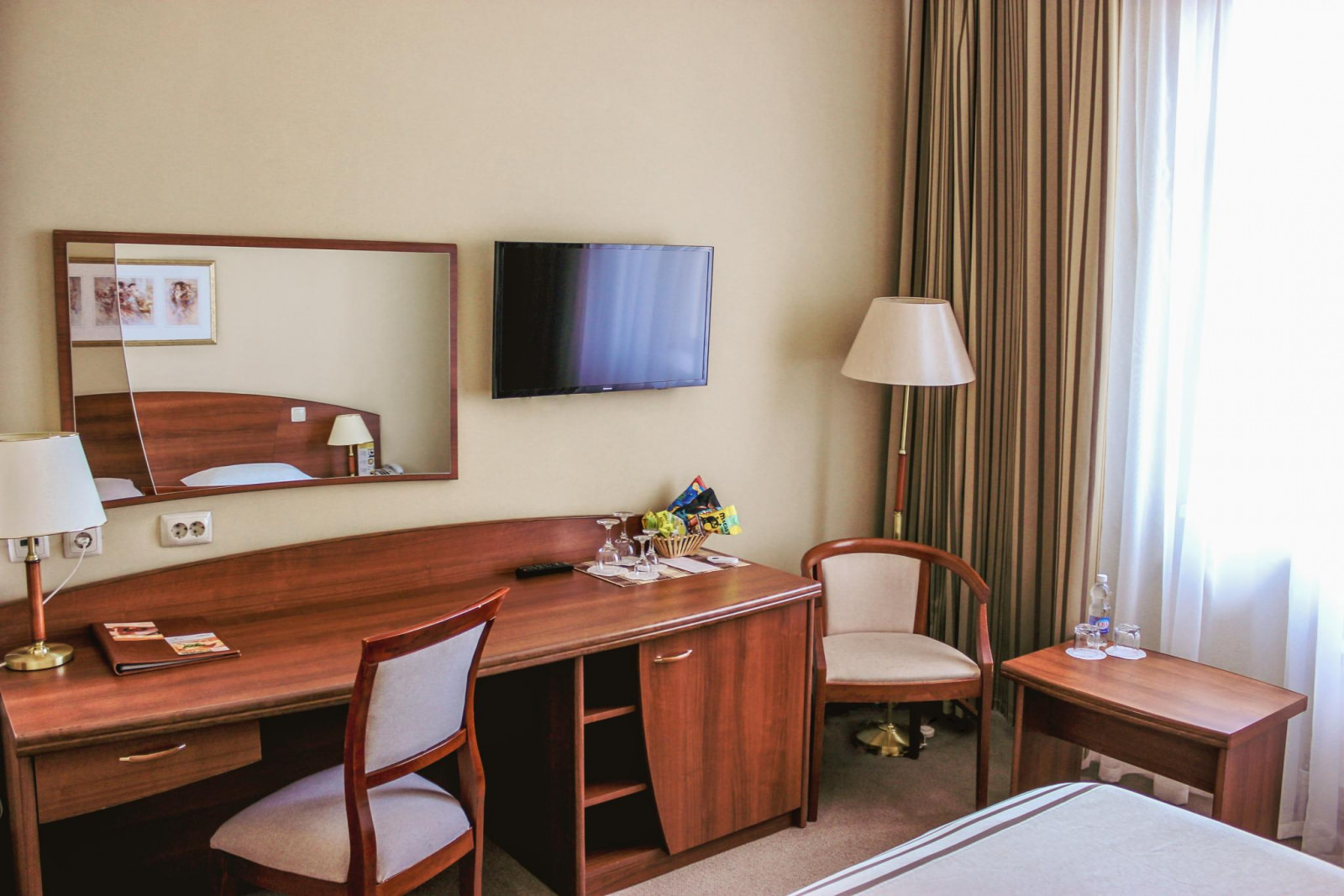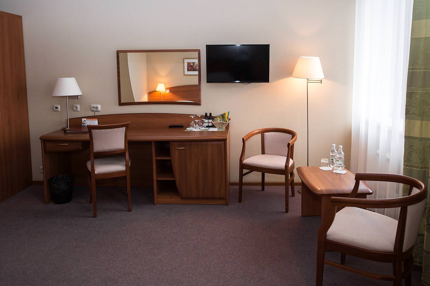 Площадь номера 27-29 кв.м., двуспальная кровать, прикроватные тумбочки, стул, стол рабочий, 2 полукресла, журнальный столик, платяной шкаф, багажная полка, телефон, кабельное ТВ, доступ к Интернет (LAN), минибар,сейф, фэн-койл, в ванной комнате душ, фен, туалетные принадлежности.