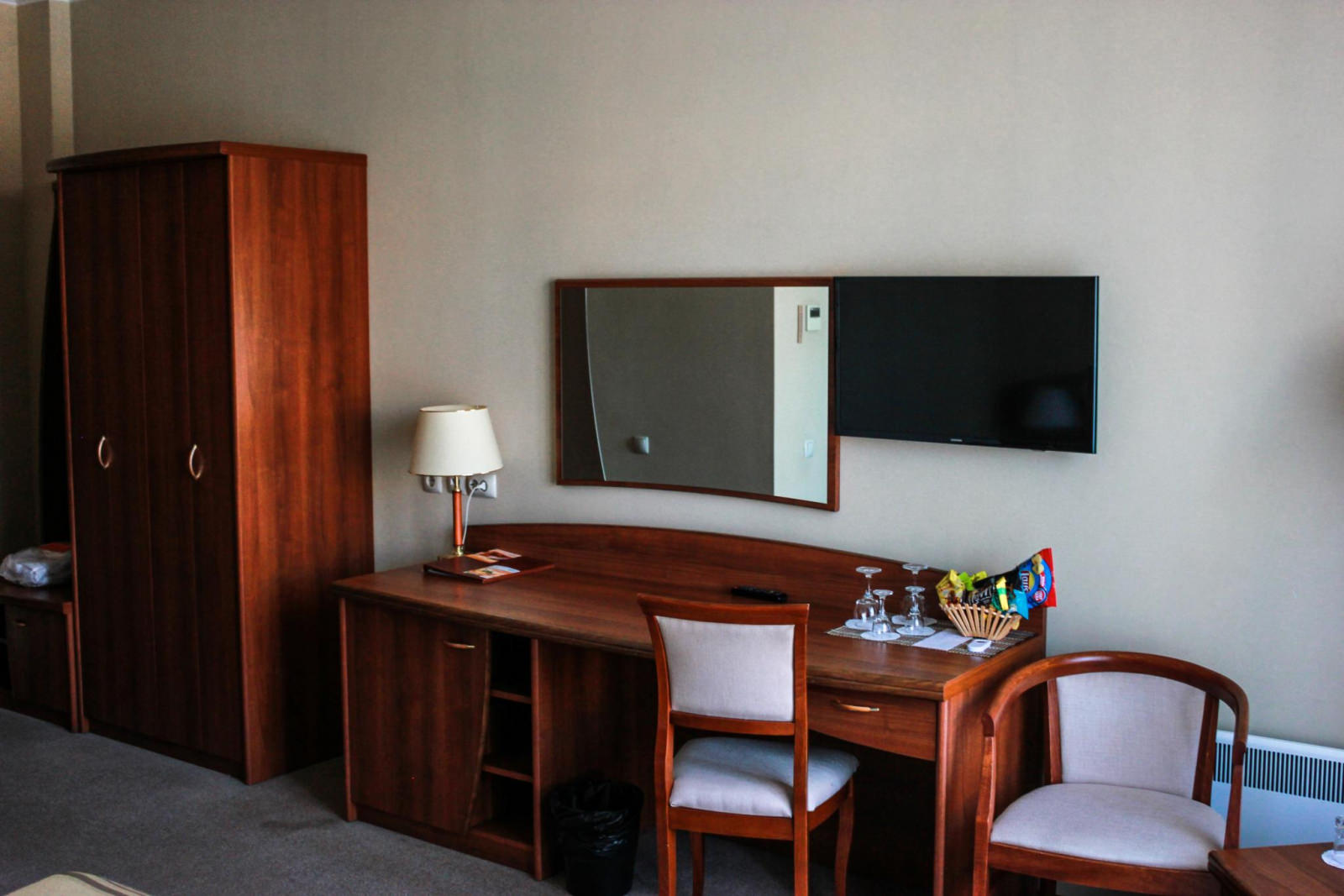Площадь номера 21-25 кв.м., двуспальная кровать, прикроватные тумбочки, стул, стол рабочий, полукресло, журнальный столик, платяной шкаф, багажная полка, телефон, кабельное ТВ, доступ к Интернет (LAN), минибар, сейф, фэн-койл, в ванной комнате душ, фен, туалетные принадлежности