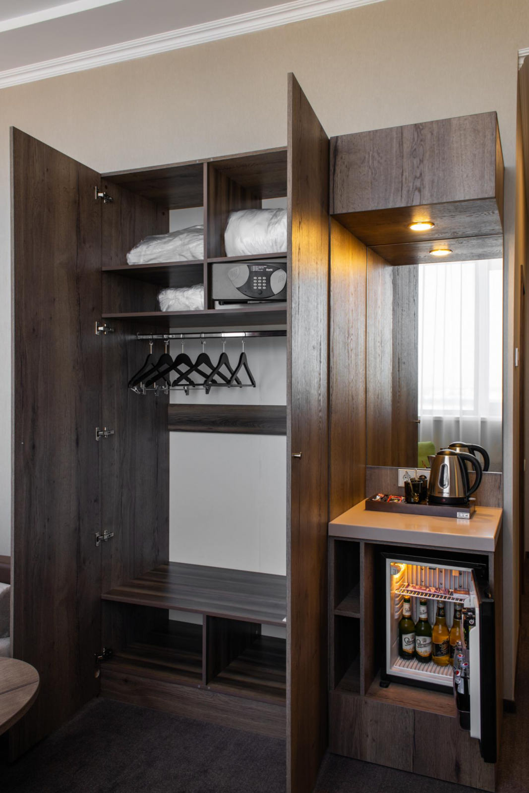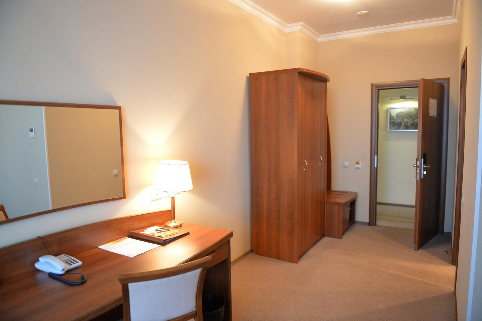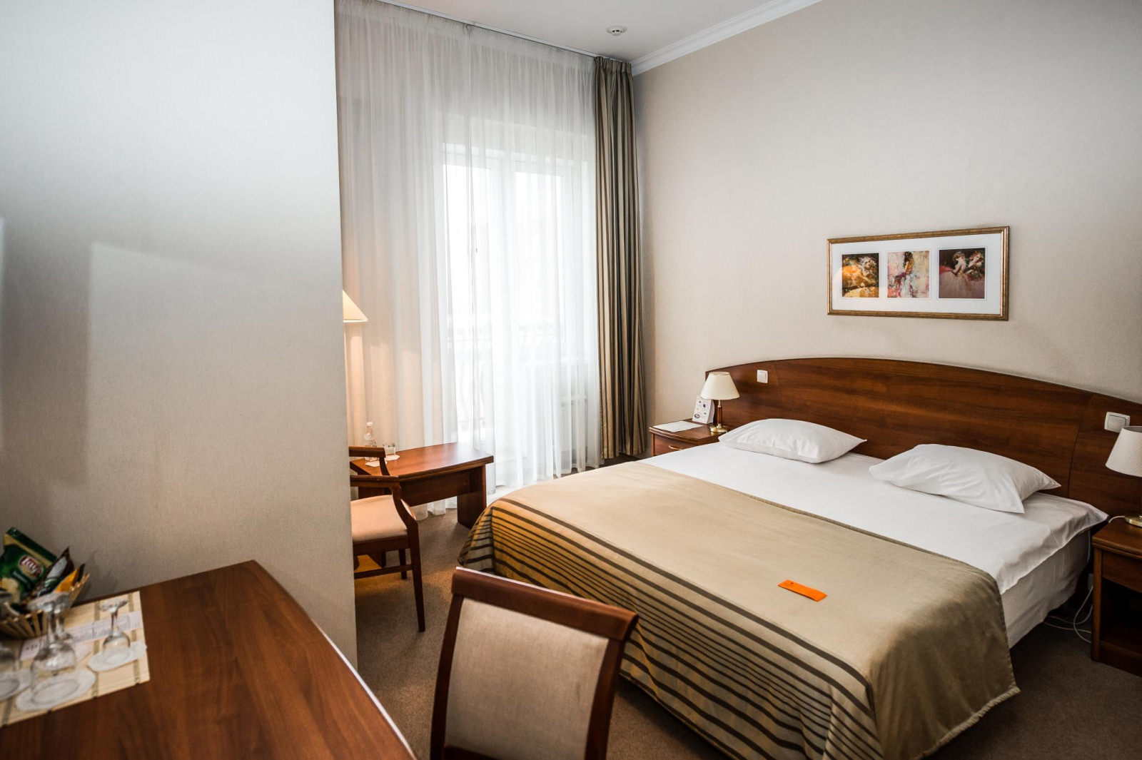 Площадь номера 21-25 кв.м., двуспальная кровать, прикроватные тумбочки, стул, стол рабочий, полукресло, журнальный столик, платяной шкаф, багажная полка, телефон, кабельное ТВ, доступ к Интернет (LAN), минибар, сейф, фэн-койл, в ванной комнате душ, фен, туалетные принадлежности.