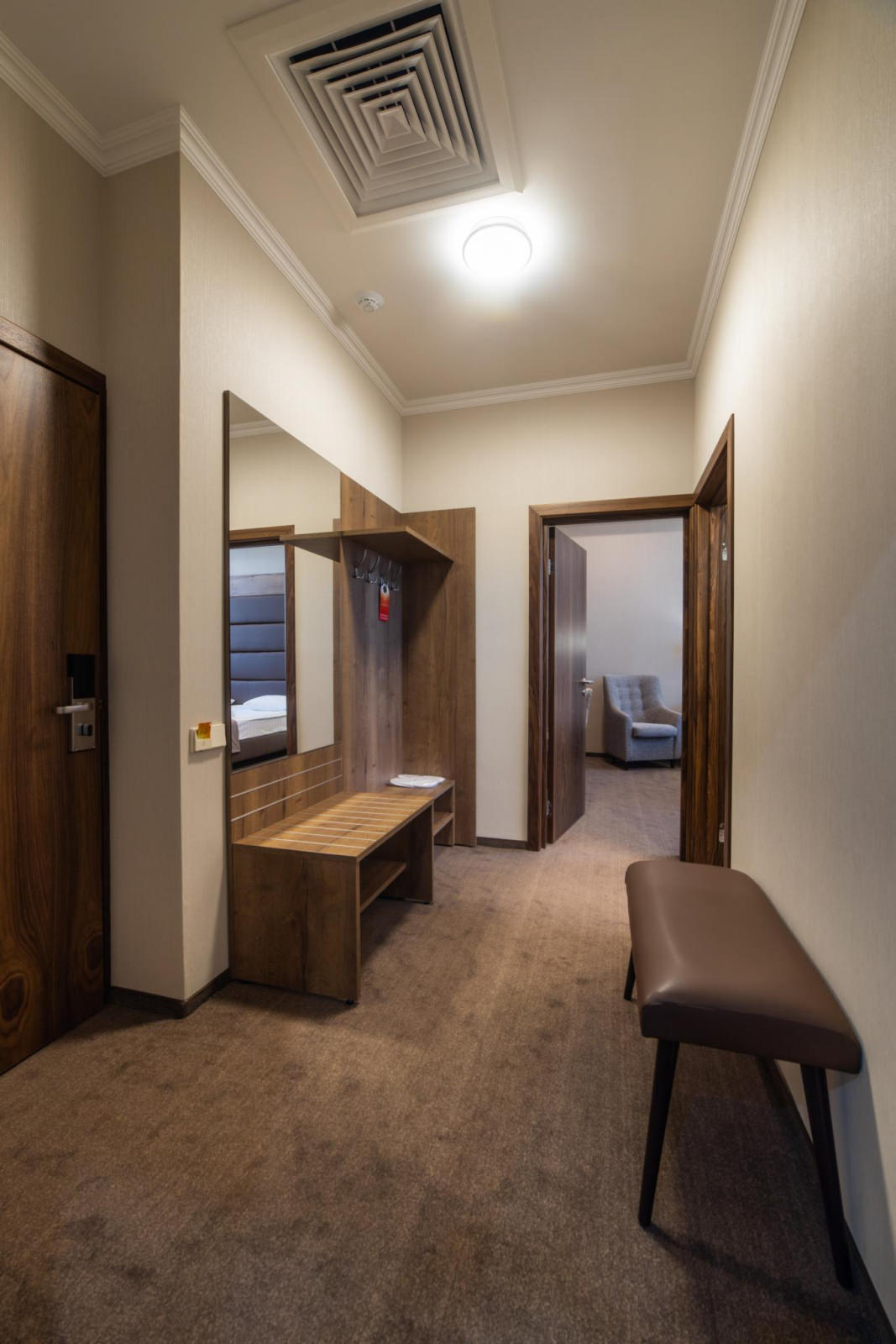 Двухкомнатный номер площадью 43-45 кв.м., в спальне двуспальная кровать, прикроватные тумбочки, стол туалетный, стул, комод, шкаф платяной, кабельное ТВ, в гостиной - журнальный столик, 2 кресла, диван, шкаф, тумба, кабельное ТВ, доступ к Интернет (LAN и Wi-Fi), минибар, фэн-койл, сейф, в ванной комнате ванна, биде, фен, туалетные принадлежности. Номера расположены на 8 этаже.