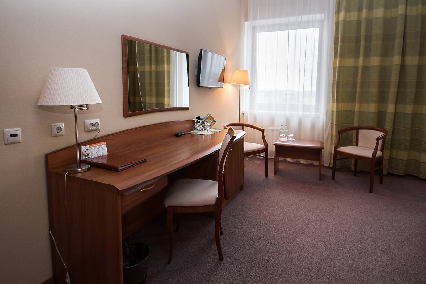 Площадь номера 27-29 кв.м., двуспальная кровать, прикроватные тумбочки, стул, стол рабочий, 2 полукресла, журнальный столик, платяной шкаф, багажная полка, телефон, кабельное ТВ, доступ к Интернет (LAN), минибар,сейф, фэн-койл, в ванной комнате душ, фен, туалетные принадлежности.