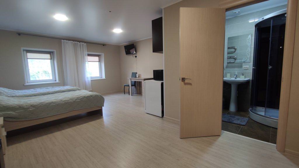 Двухместный номер с красивым видом из окна. В апартаментах есть все необходимое для комфортного проживания, оборудованная кухня, обеденная зона, двуспальная кровать, телевизор, холодильник, стиральная машина, микроволновая печь, собственная ванная комната с душем.