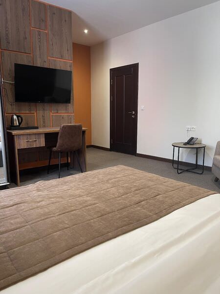 Площадь номера - 22 кв.м.; В номере: Сейф, Телевизор, Кабельное/спутниковое/цифровое телевидение, Тапочки, Кухня, Услуга будильник, Фен, Набор косметики (туалетные принадлежности), Набор для приготовления чая/кофе, Ежедневная уборка, Рабочая зона, Душ/душевая кабинка, Двуспальная кровать, Туалет в номере, Тумбочка, Шкаф, Чайник, Утюг, Гладильная доска; Макс. кол-во гостей - 2