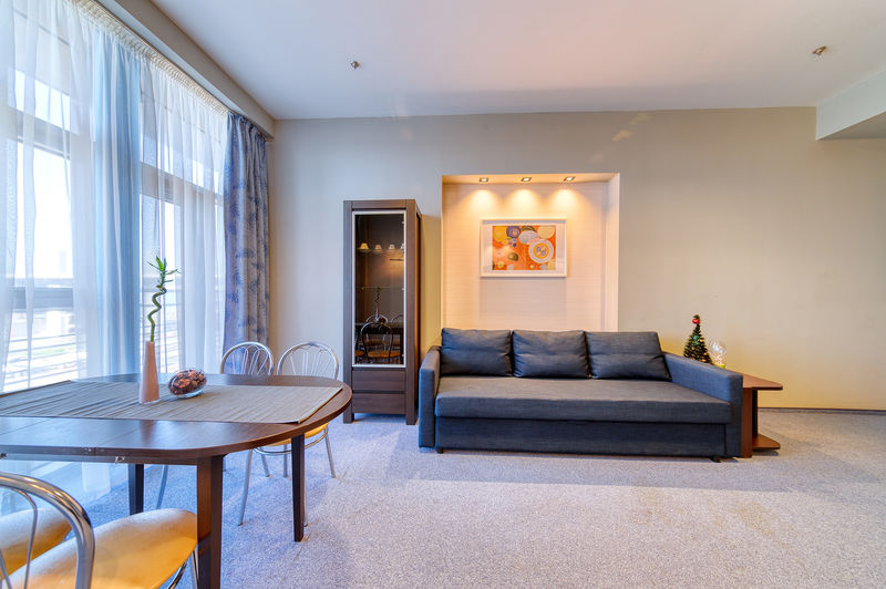 Площадь номера - 50 кв.м.; В номере: Кондиционер, Холодильник, Телевизор, Балкон, Фен, Набор косметики (туалетные принадлежности), Набор для приготовления чая/кофе, Ванна, Душ/душевая кабинка, Двуспальная кровать, Туалет в номере, Тумбочка, Шкаф, Чайник, Сплит-система , Диван; Макс. кол-во гостей - 4