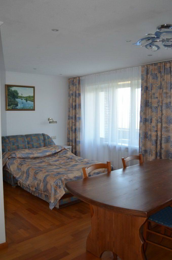 Светлый номер с телевизором, холодильником, собственной ванной комнатой и балконом с видом на реку. В номере: одна большая кровать; Балкон; Телевизор; Телефон; Собственная ванная комната; Холодильник; диван; кресла.