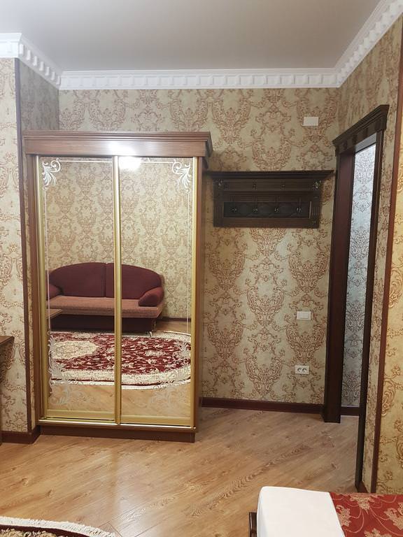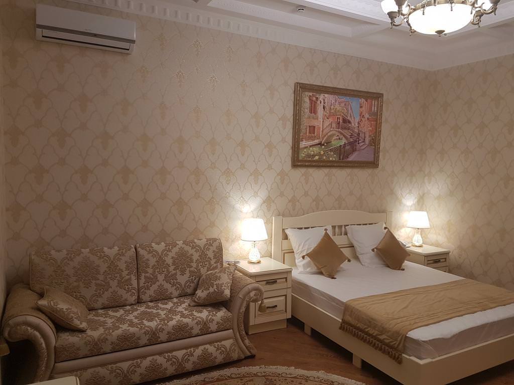 Уютный, светлый номер. В номере: двуспальная кровать, диван, Wi-Fi, кондиционер, телефон, фен, спутниковое телевидение, светильник, холодильник, вешалки, обеденный стол, письменный стол, стулья, шкаф для одежды, ковер. В ванной комнате: ванная комната, душевая кабина, гигиенические средства, туалет, раковина, тапочки, халаты.