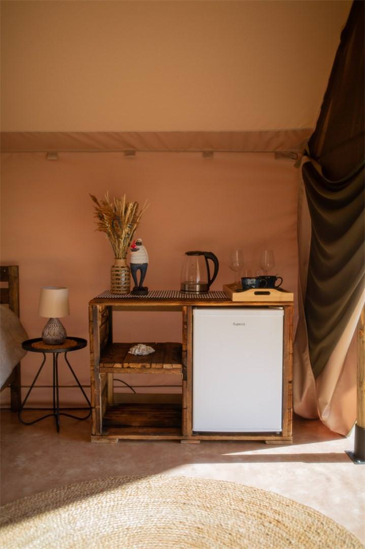 Уютный Тент-хаус в 50-ти метрах от воды на морском берегу с белоснежным песком и экологически чистой водой. Отлично подходит для романтического отдыха с любимым человеком или спокойного отдыха с семьей. Гостей ждет безумно красивый вид на море с личной террасы, песчаные дюны, шум волн и незабываемые алые закаты балтийского побережья. В шале персональный душ и туалет со всем необходимым для личной гигиены находится в самом Тент-хаусе. Внутри Тент-хауса удобный продуманный интерьер, включающий в себя: сундук с замком и вешалку для вещей; большую двуспальную кровать; диванчик с дополнительным спальным местом; столик со стульями; холодильник; бутилированная питьевая вода. Электроника: мини-холодильник. Ванная комната: унитаз, душевая кабина, раковина. Внешняя территория и вид из окон: терраса, вид на море. Отдельный вход в номер, панорамные окна. Высокие потолки. Кровать «Queen size», зеркало, стол, стулья, эксклюзивная мебель, шкаф для одежды. Бутилированная вода, стаканы.