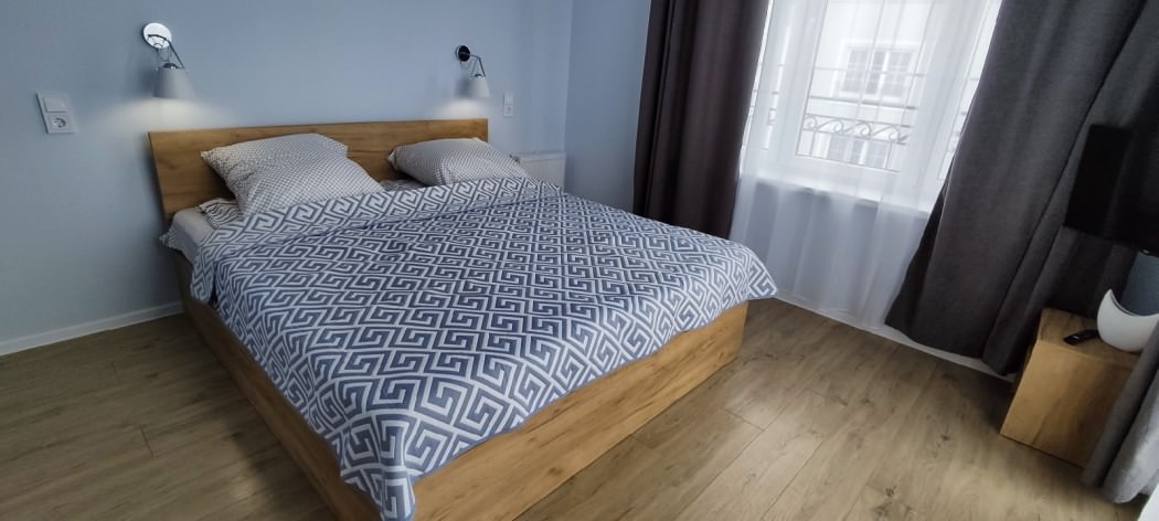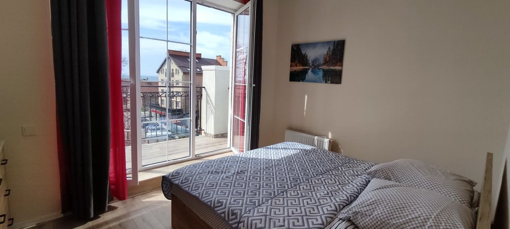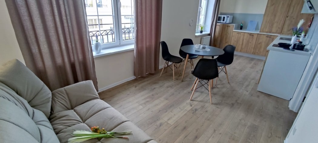 Площадь номера - 40 кв.м. 2 осн. места. 1 доп. место. Балкон. Кухня. Мебель: гардеробная, зеркало, кровать двуспальная, кухонная мебель, стол, стулья, тумба под телевизор, шкаф. Оборудование: микроволновая печь, набор посуды, плита электрическая, стиральная машина, телевизор ЖК, утюг, холодильник, электрочайник. Санузел: с ванной, тапочки, туалетные принадлежности, фен. Сервис: Wi-Fi бесплатно, смена полотенец (в день заезда, далее за доп. плату), смена постельного белья (в день заезда, далее за доп. плату), уборка номера (в день заезда, далее за доп. плату).