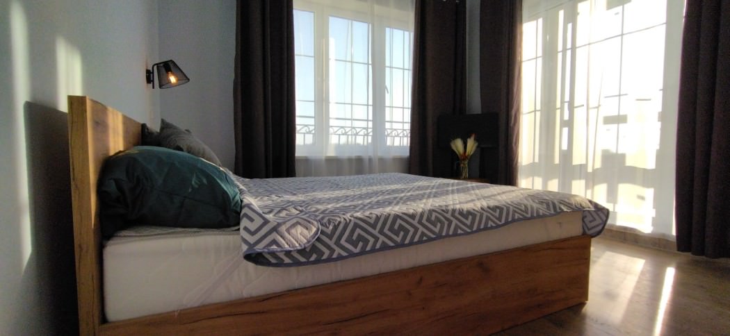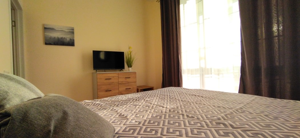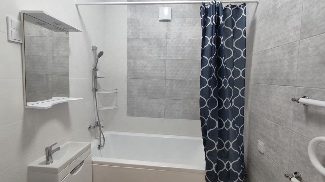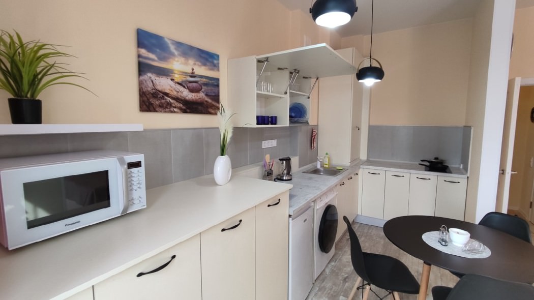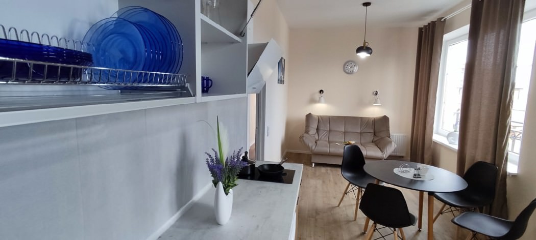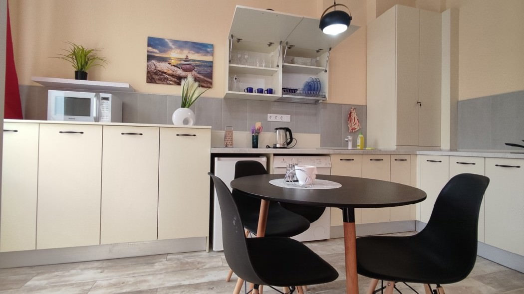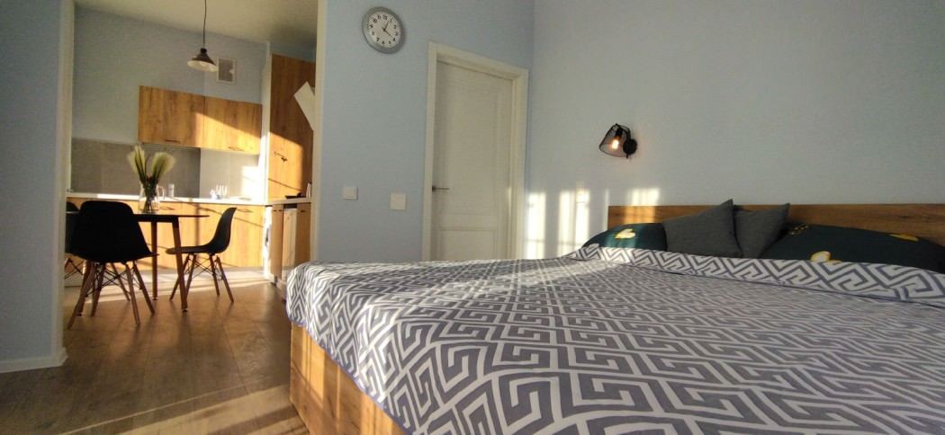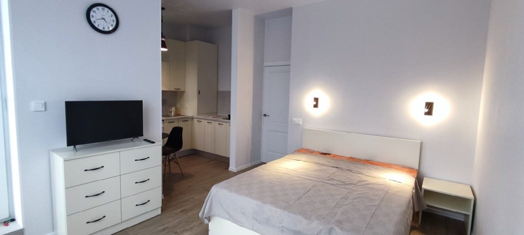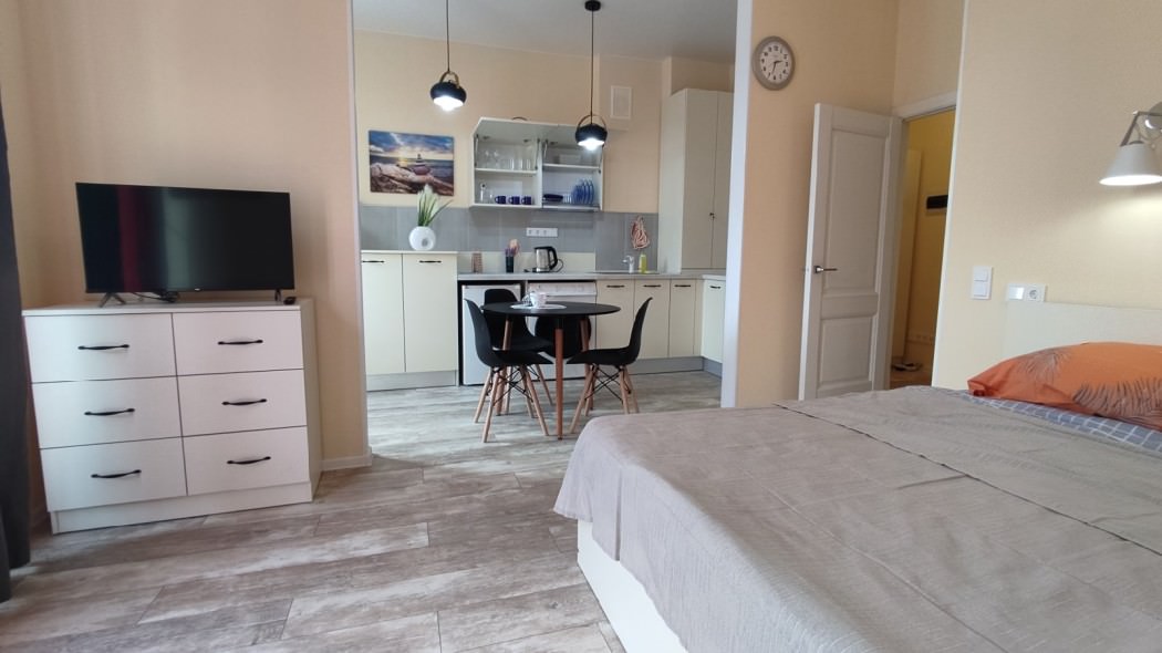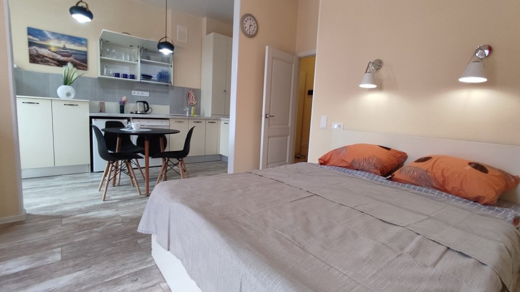Площадь номера - 45 кв.м. 2 осн. места. Балкон. Кухня. Мебель: зеркало, кровать двуспальная, кухонная мебель, стол, стулья, шкаф. Оборудование: вентилятор, микроволновая печь, набор посуды, плита электрическая, стиральная машина, телевизор ЖК, утюг, холодильник, электрочайник. Санузел: с ванной, тапочки, туалетные принадлежности, фен. Сервис: Wi-Fi бесплатно, смена полотенец (в день заезда, далее за доп. плату), смена постельного белья (в день заезда, далее за доп. плату), уборка номера (в день заезда, далее за доп. плату).