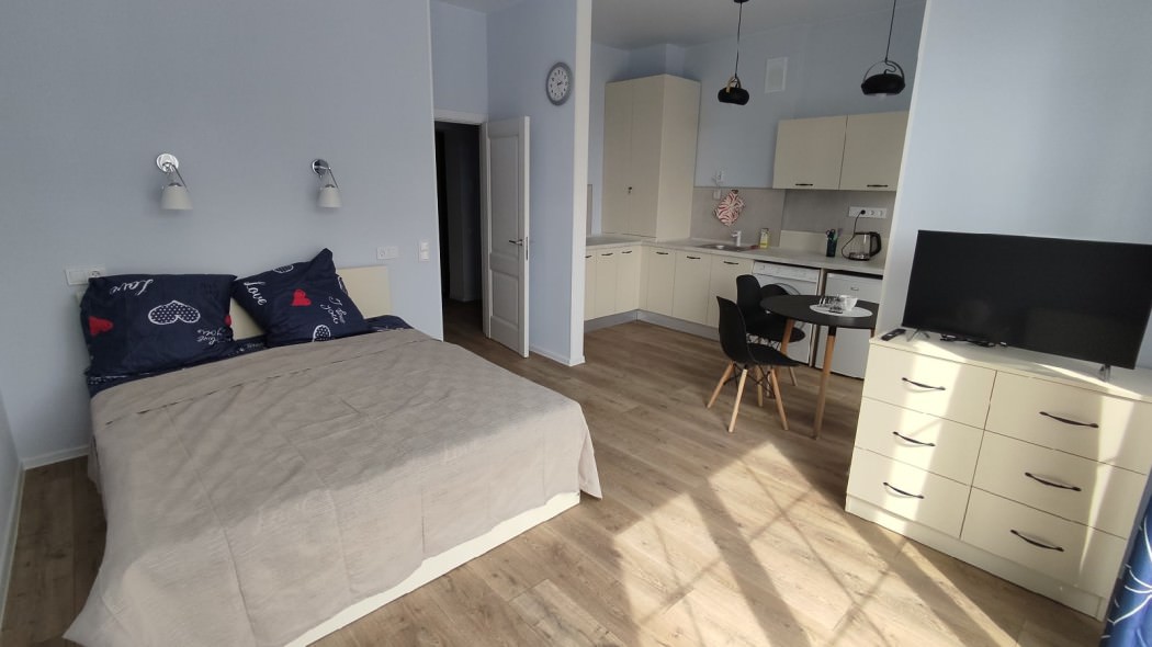 Площадь номера - 30 кв.м. 2 осн. места. 1 доп. место. Балкон. Кухня. Мебель: зеркало, кровать двуспальная, кухонная мебель, стол, стулья, тумба под телевизор, шкаф. Оборудование: микроволновая печь, мини-холодильник, набор посуды, плита электрическая, стиральная машина, телевизор ЖК, утюг, электрочайник. Санузел: с ванной, тапочки, туалетные принадлежности, фен. Сервис: Wi-Fi бесплатно, смена полотенец (в день заезда, далее за доп. плату), смена постельного белья (в день заезда, далее за доп. плату), уборка номера (в день заезда, далее за доп. плату).