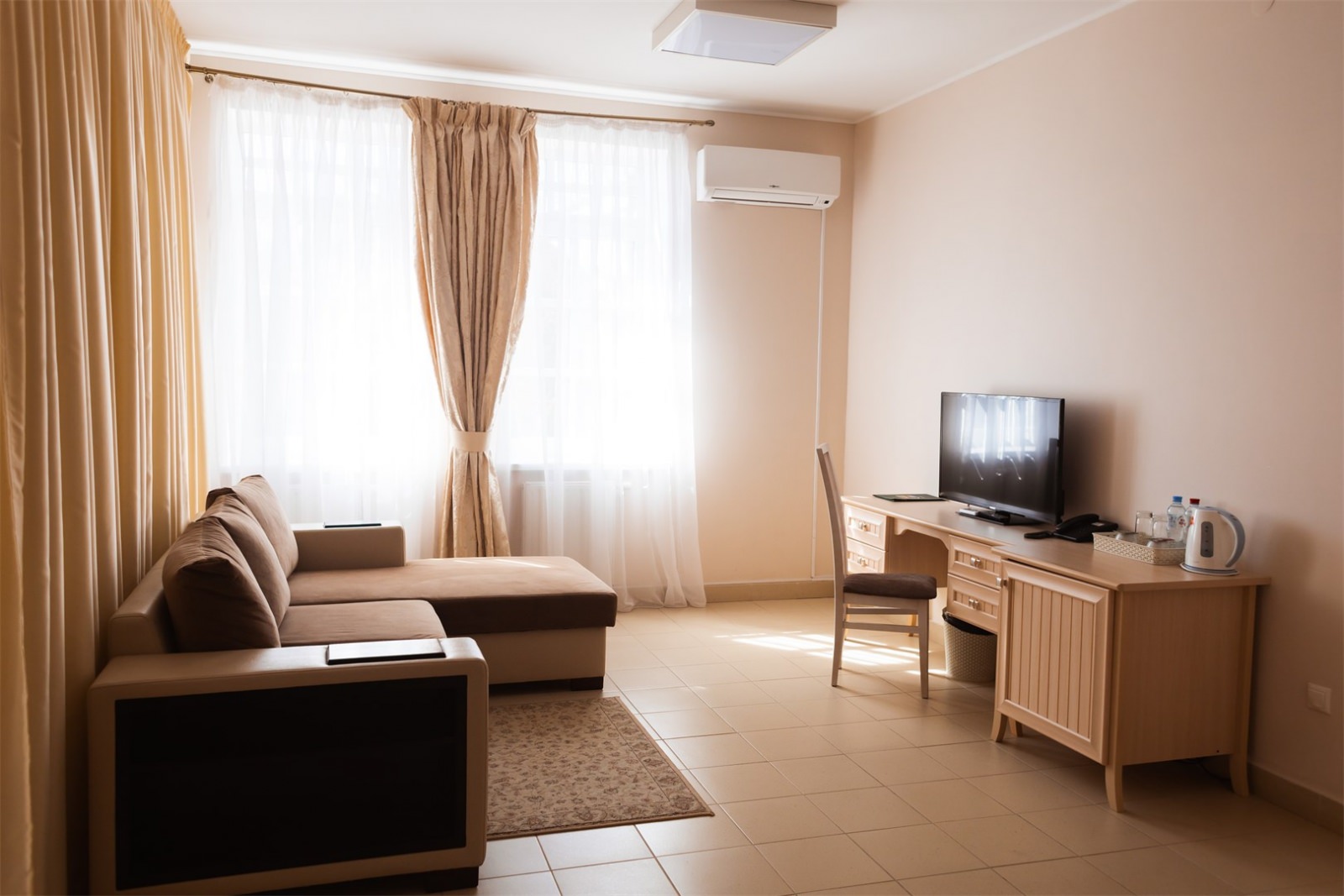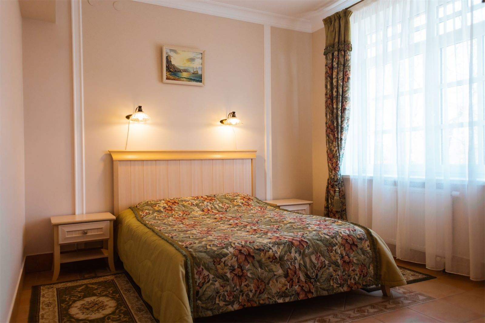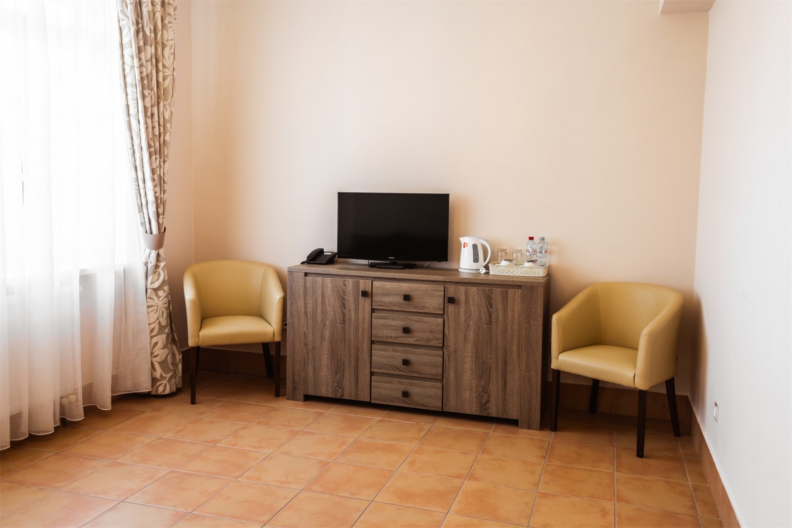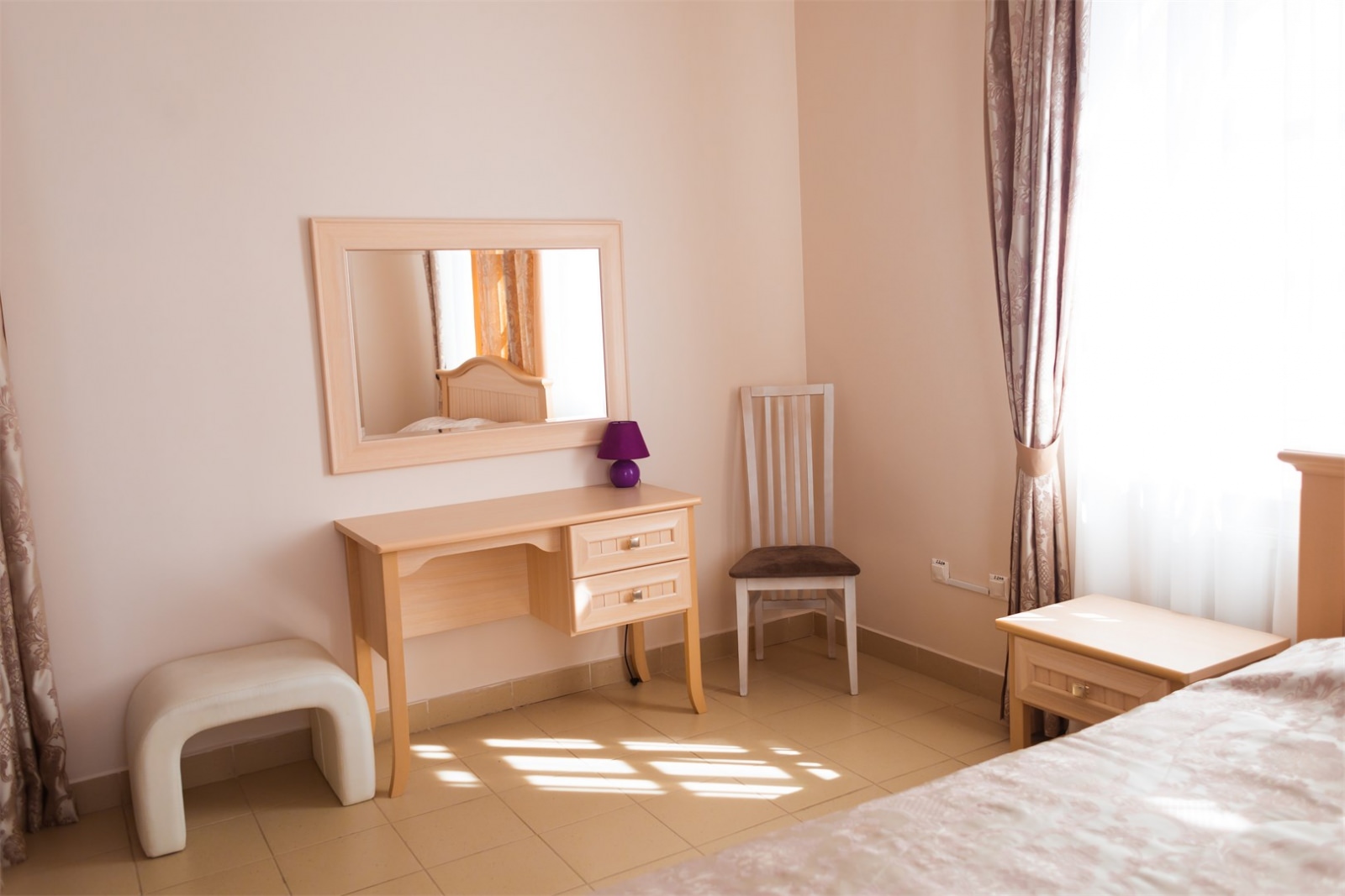 Номер - состоит из двух комнат: гостиной и спальни, прихожей и ванной комнаты, площадью 45-50 кв. м. Номер меблирован по евростандарту и оборудован всем необходимым для комфортного отдыха.