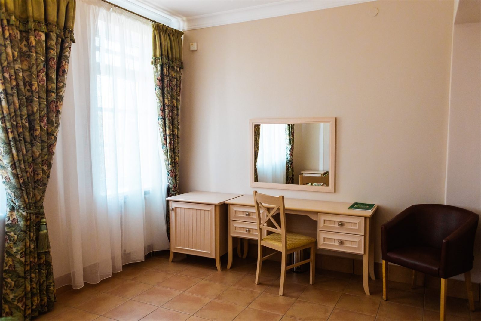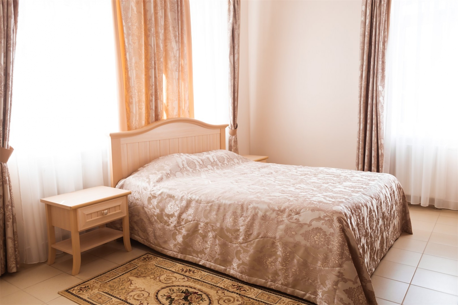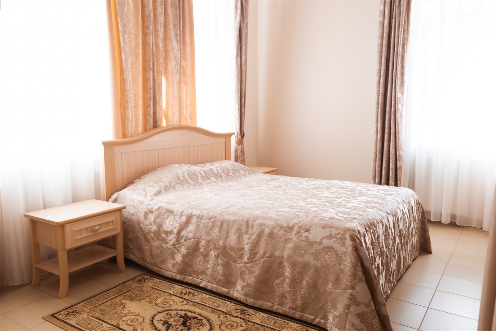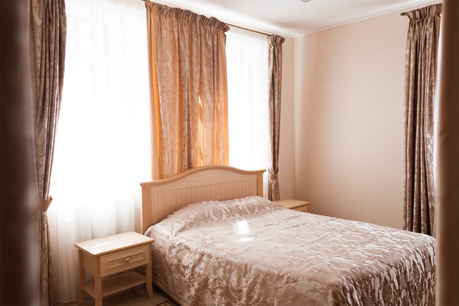 Номер - состоит из двух комнат: гостиной и спальни, прихожей и ванной комнаты, площадью 45-50 кв. м. Номер меблирован по евростандарту и оборудован всем необходимым для комфортного отдыха.