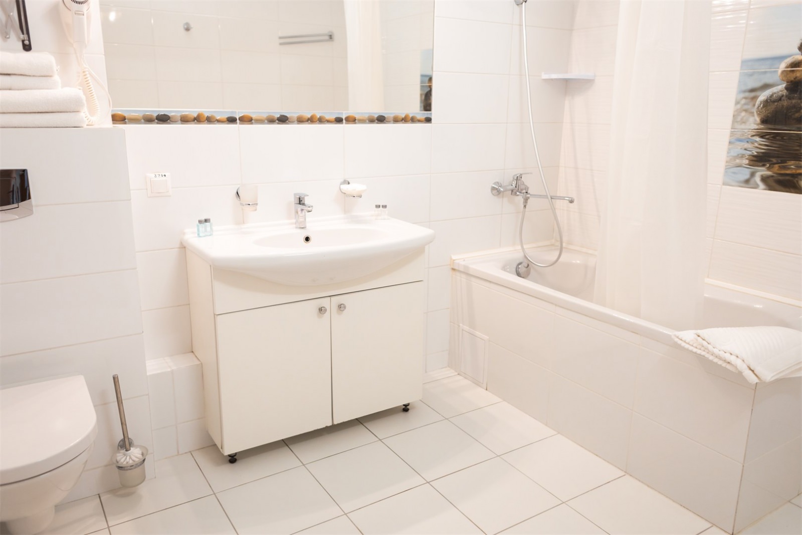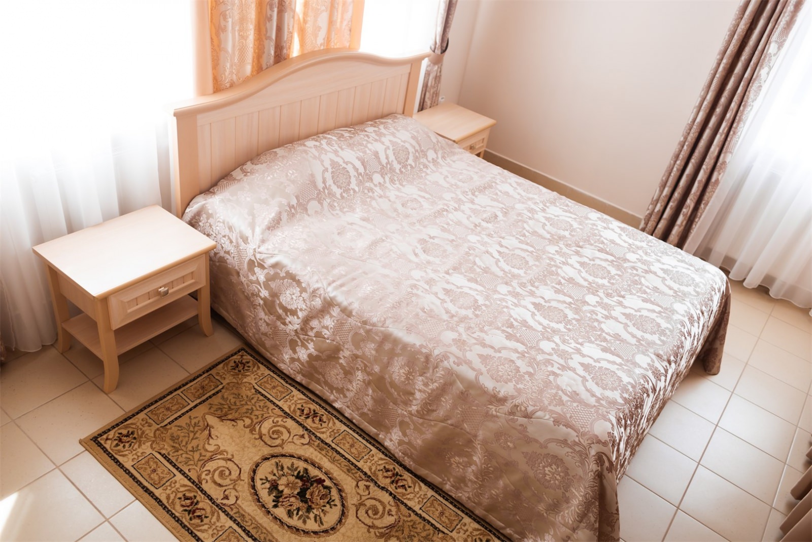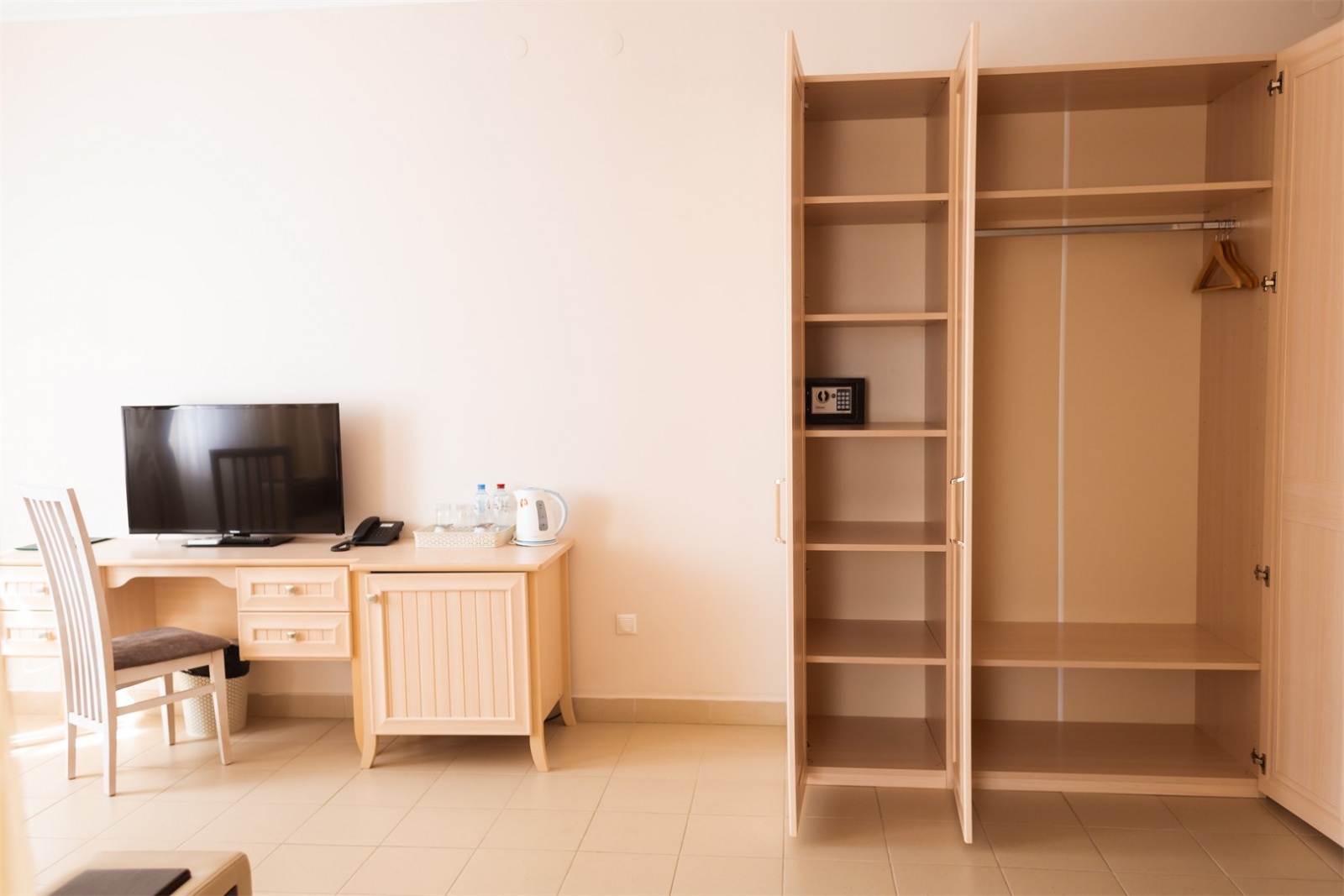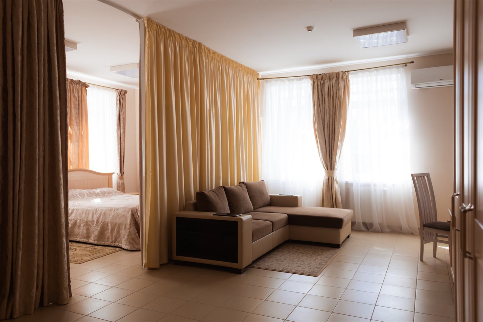 Номер - состоит из двух комнат: гостиной и спальни, прихожей и ванной комнаты, площадью 45-50 кв. м. Номер меблирован по евростандарту и оборудован всем необходимым для комфортного отдыха.