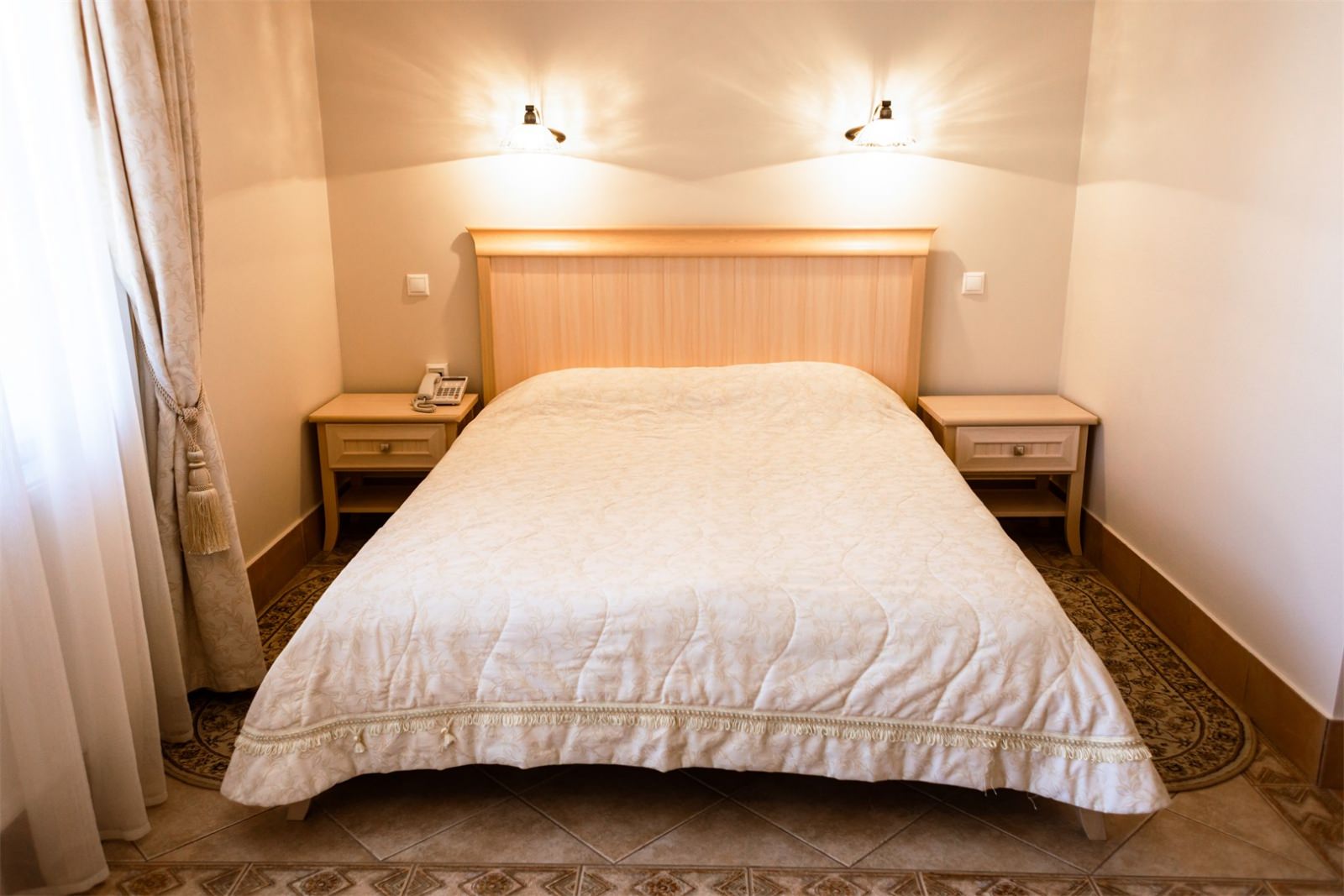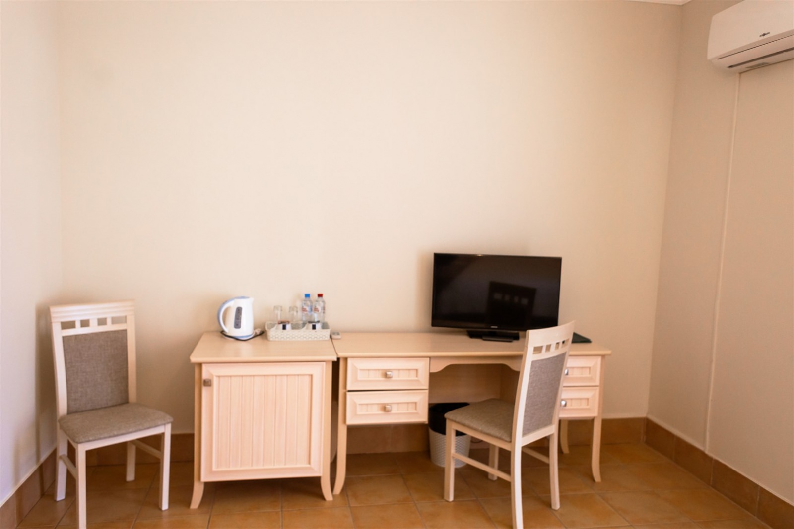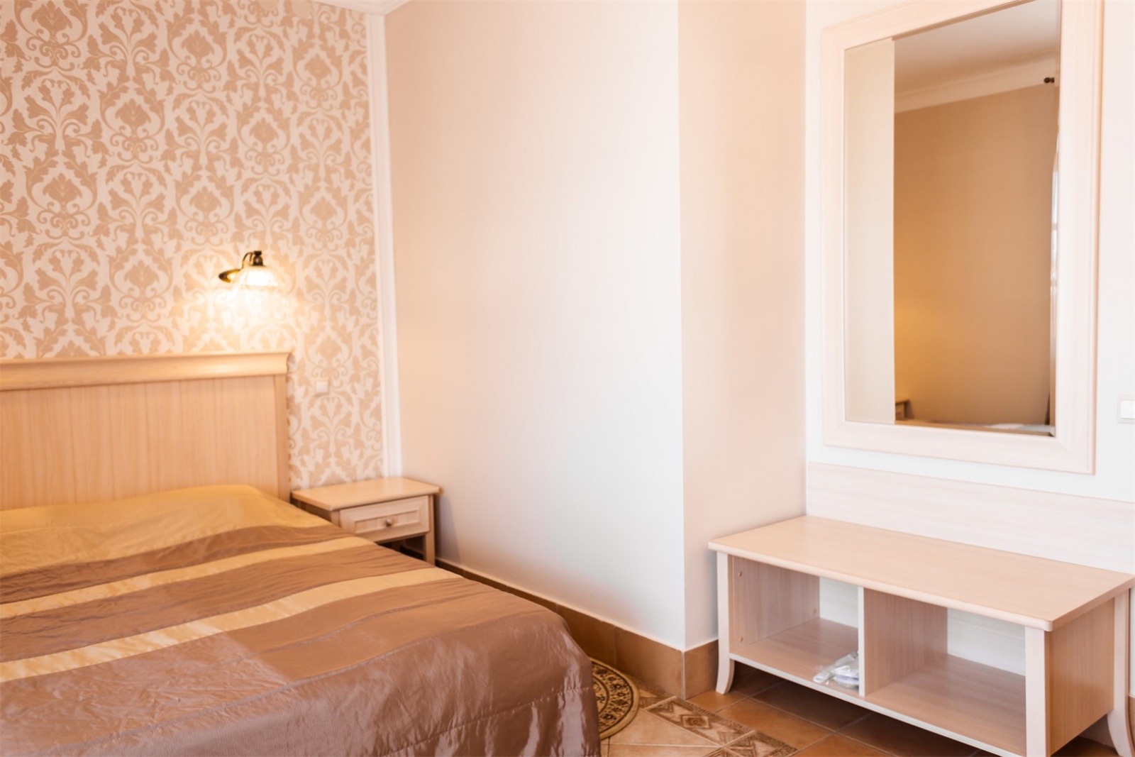 Двухместный номер стандарт состоит из комнаты, прихожей и ванной комнаты, площадь 30-35 кв. м. Номер мебелирован по евростандарту и оборудован всем необходимым для комфортного отдыха.