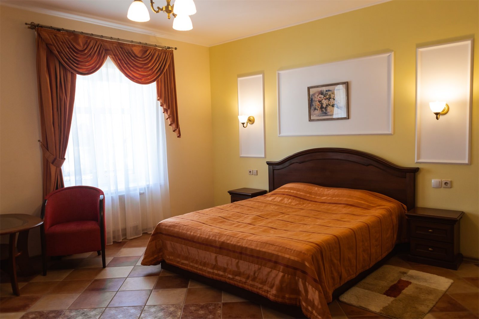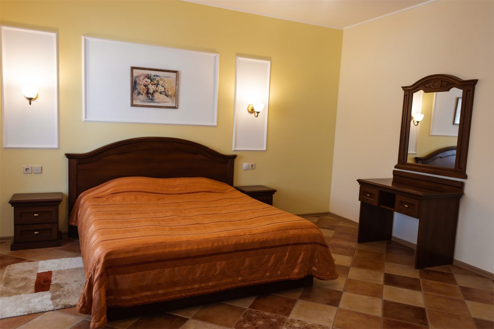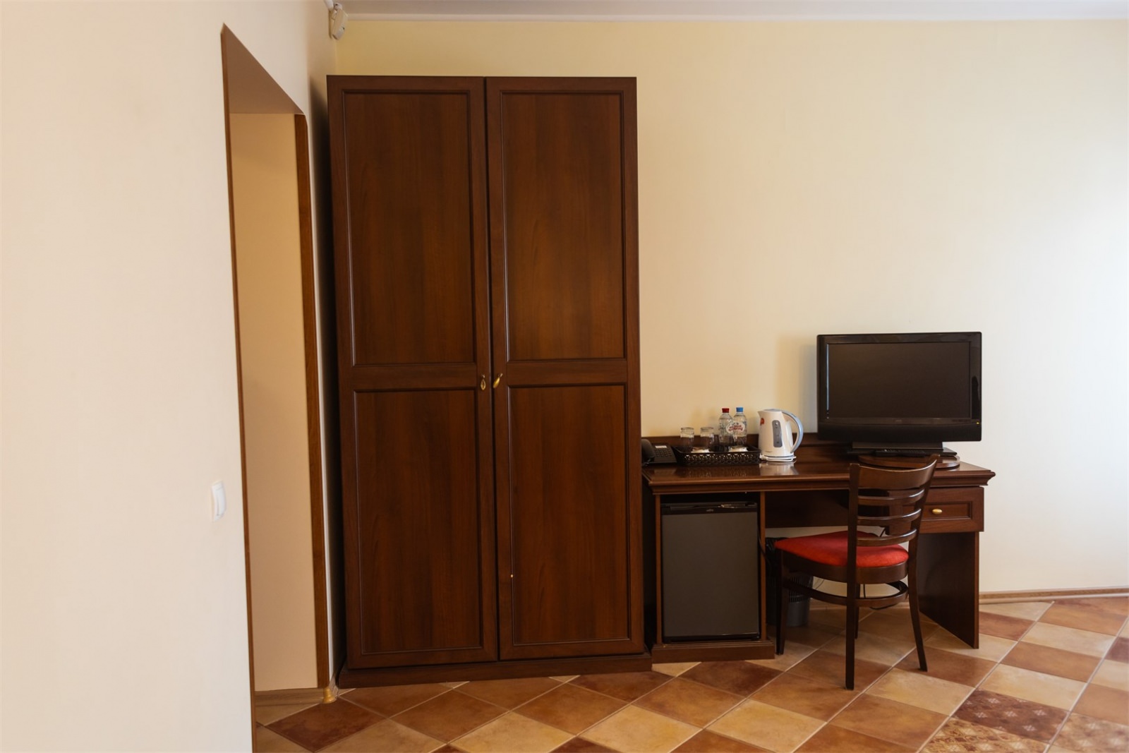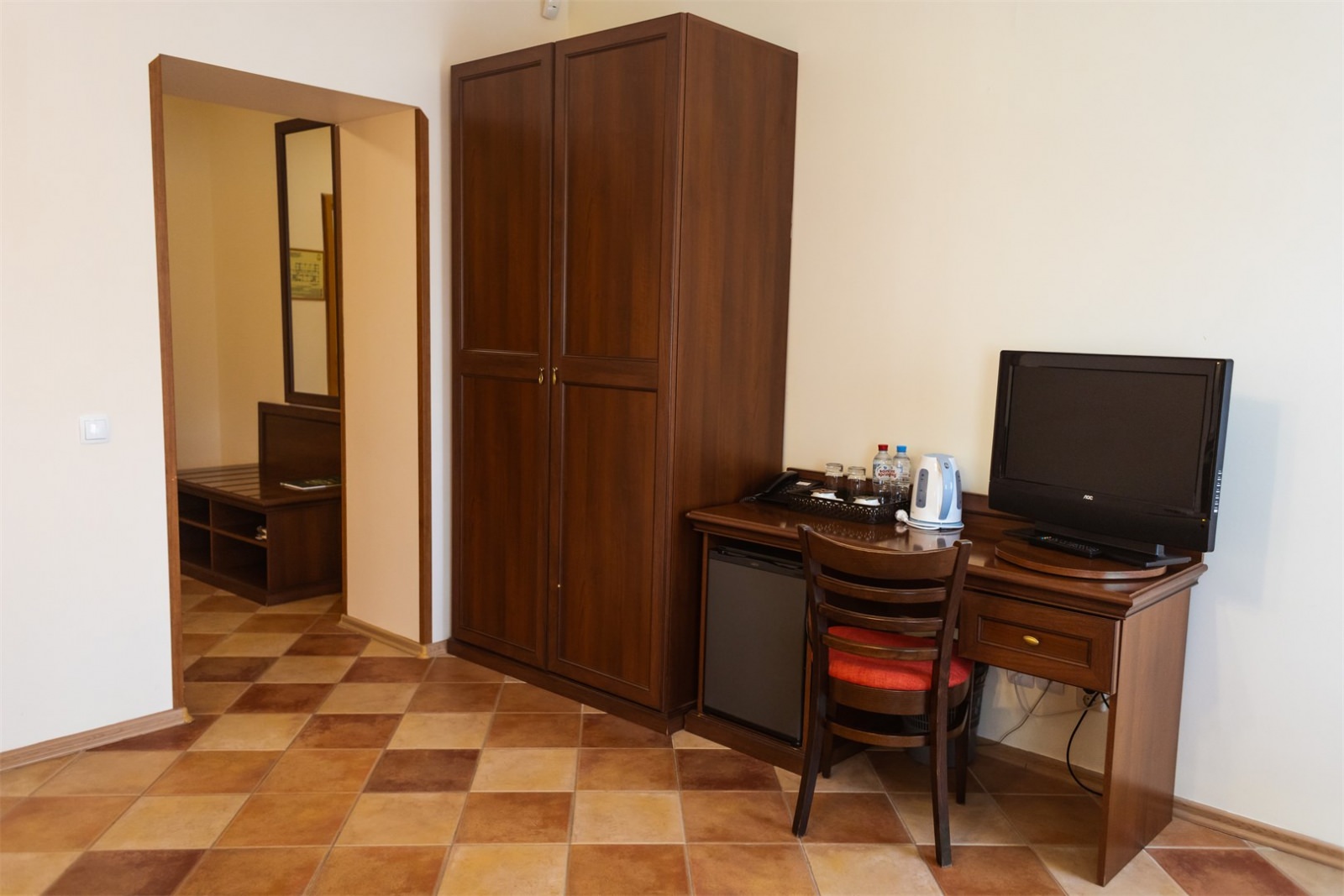 Номер состоит из комнаты, прихожей и ванной комнаты, площадь 30-35 кв. м. Меблирован по евростандарту и оборудован всем необходимым для комфортного отдыха.