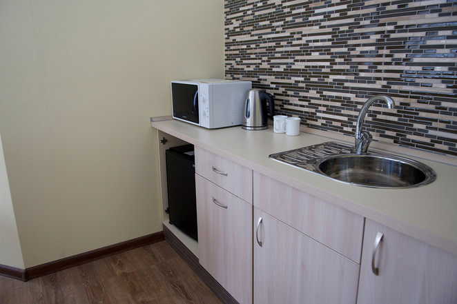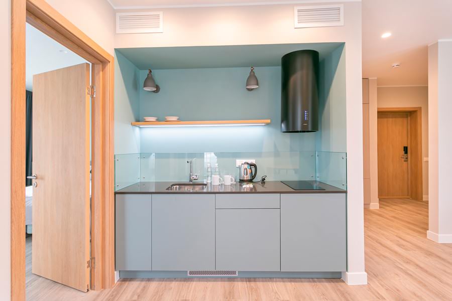 Двухкомнатный номер, состоящий из спальни и гостиной. В кухонной зоне гостиной имеется индукционная плита на две конфорки, набор посуды, электрический чайник.