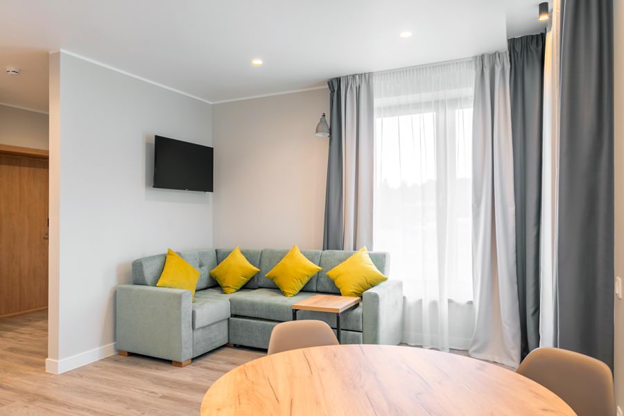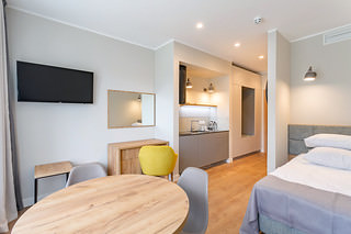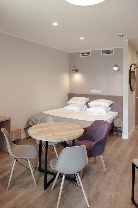 Номер подойдет для двоих или троих гостей. Он включает одну комнату с кухонной зоной.