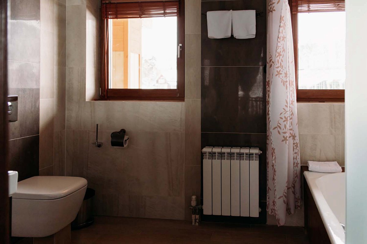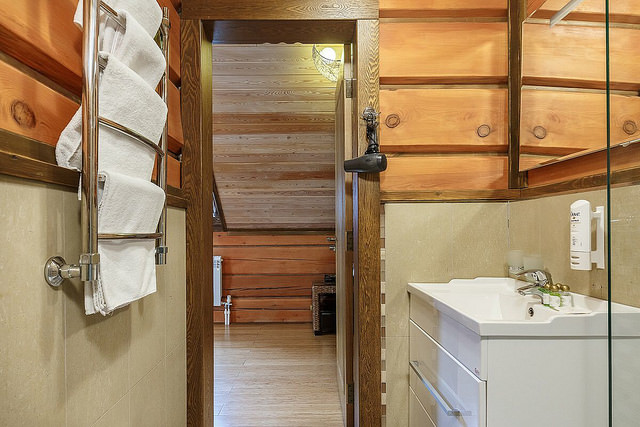 Санузел оборудован ванной с душем и другими первостепенными удобствами. Также, гости найдут здесь халаты, тапочки, фен и средства личной гигиены.