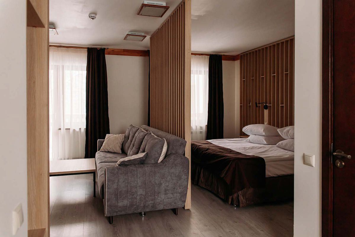 Номера suite являются двухкомнатными (спальня и гостиная) и имеют площадь 50 кв. метров, поэтому двум гостям в помещении будет просторно, а также предусмотрено два дополнительных места. Есть балкон.