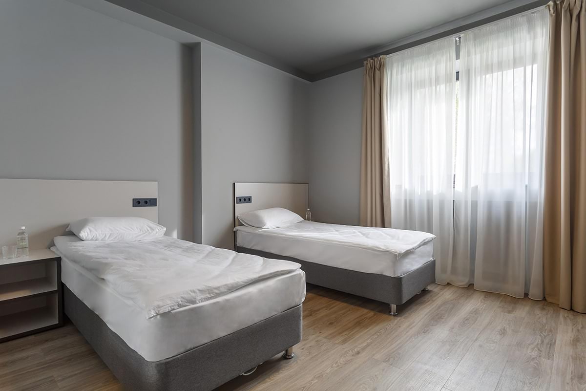 В просторном помещении имеются две удобные односпальные кровати. Для комфортного проживания гостей есть телевизор, чайник, набор посуды и фен.