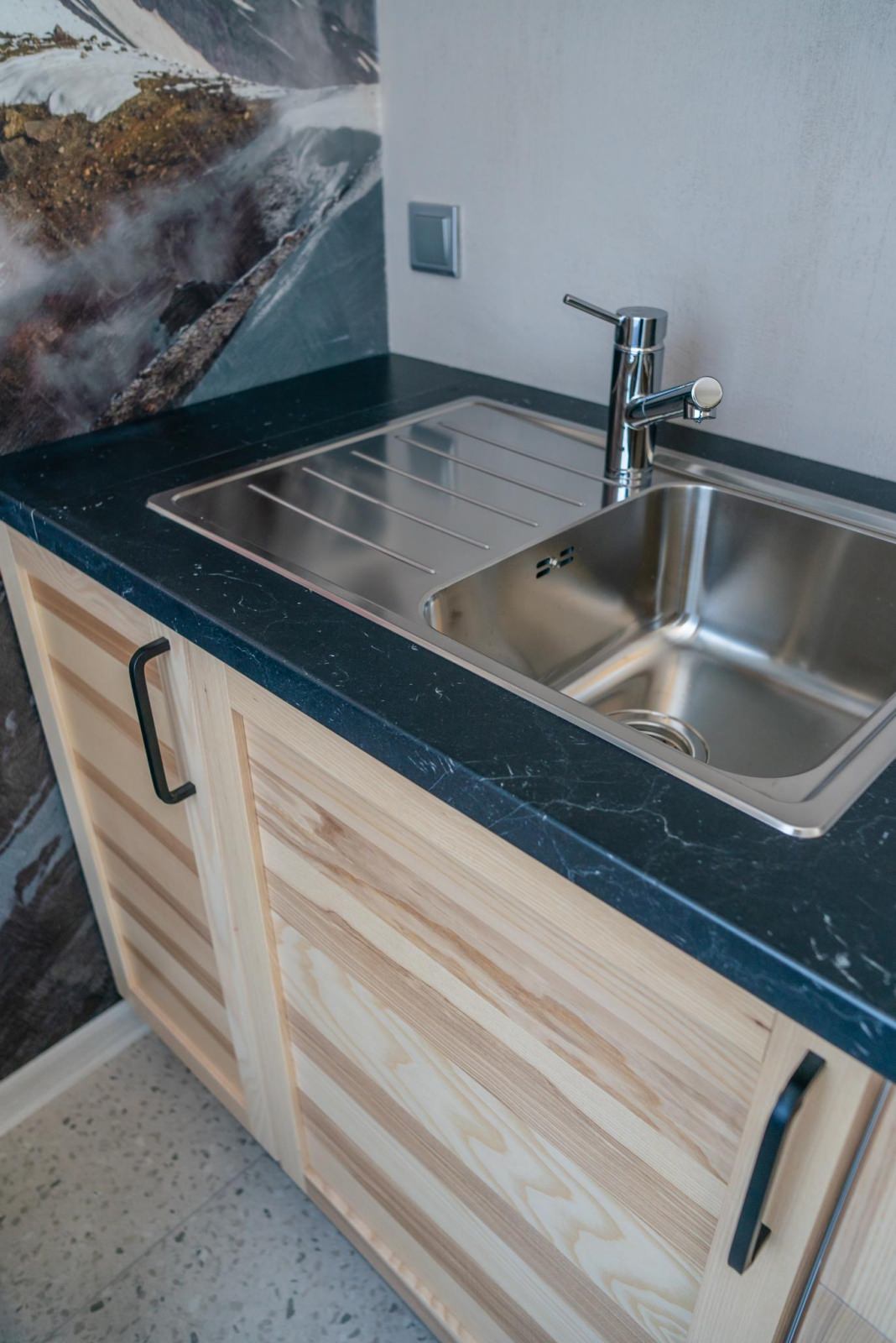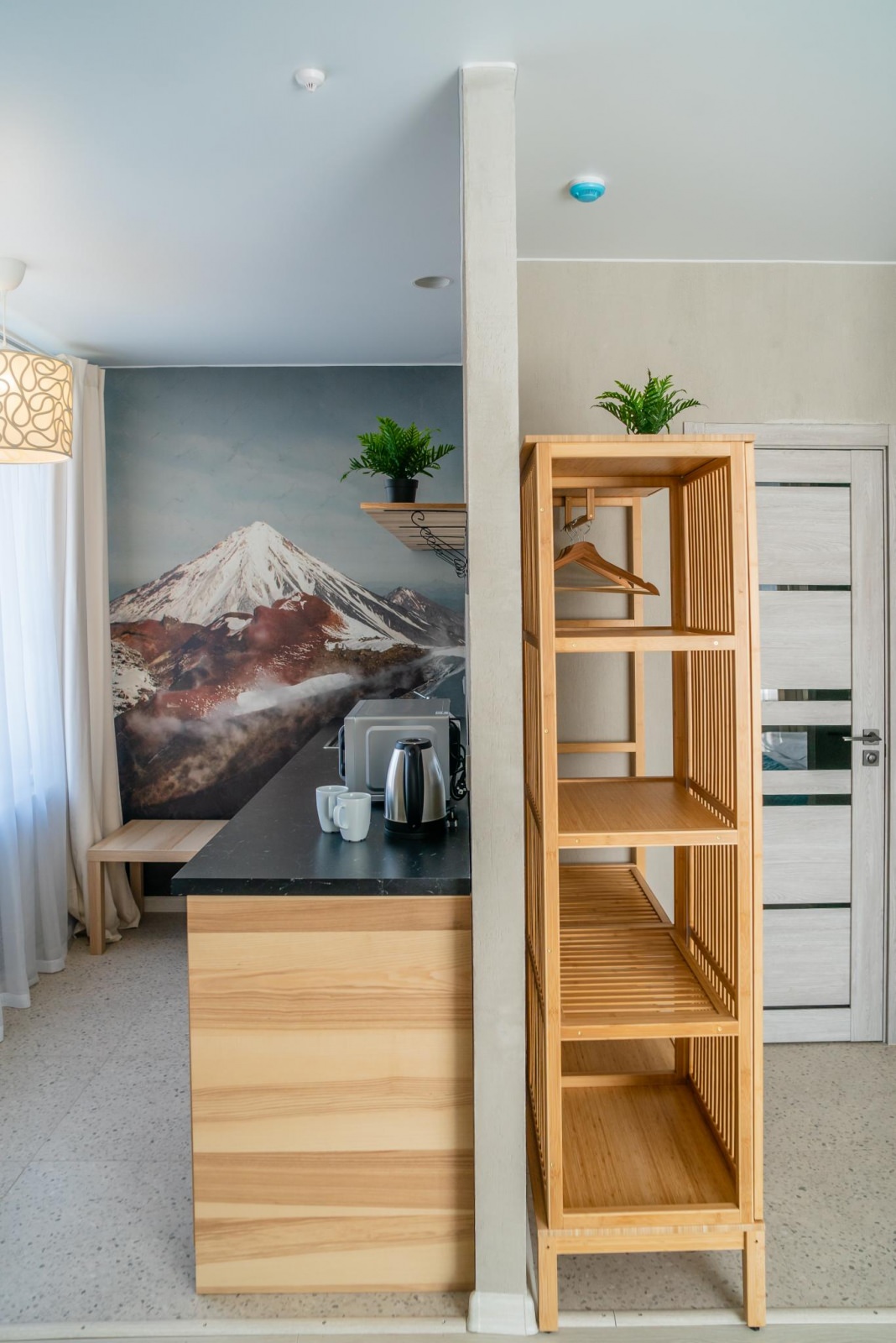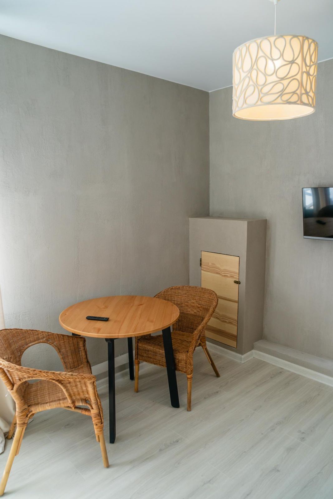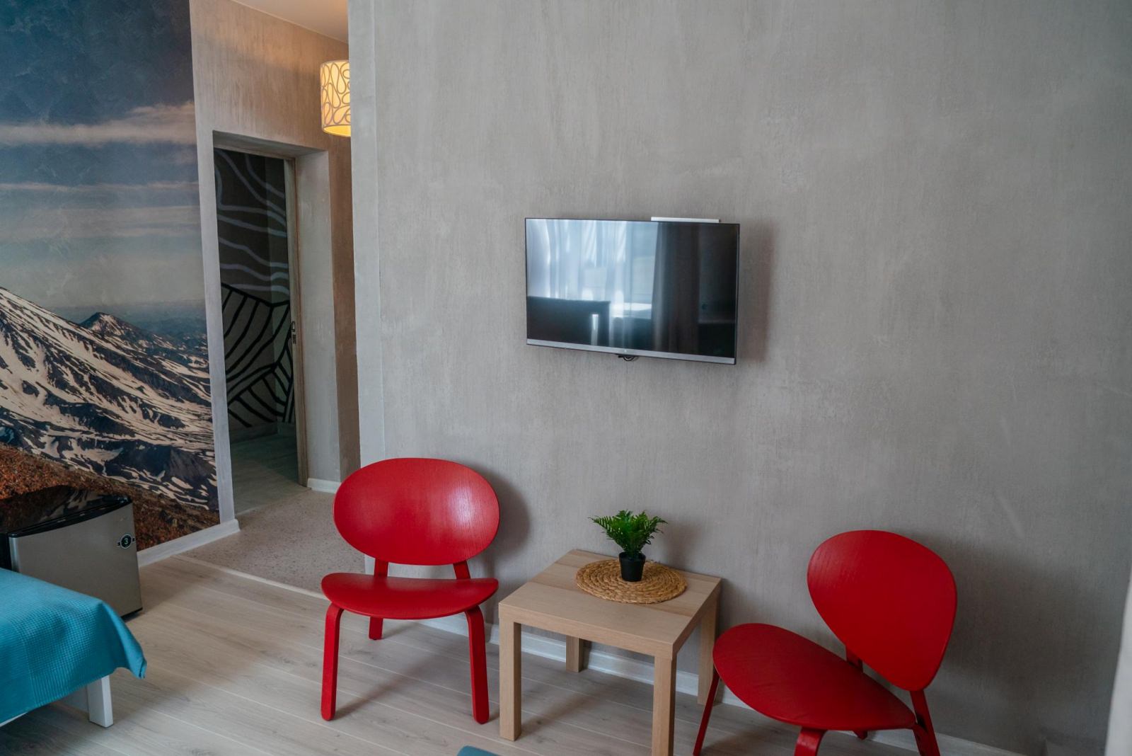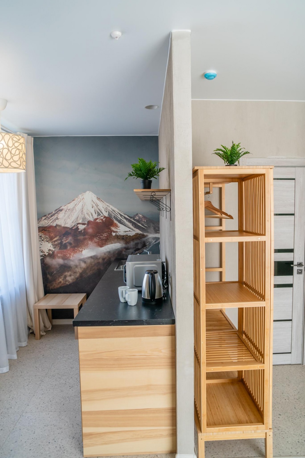 Однокомнатная студия с двуспальной кроватью и дополнительно раскладывающимся диваном и собственной душевой/туалетной комнатой. Номер оснащен ТВ, шкафом, столом, стульями, тумбочками, диваном. Кухня оснащена посудой, холодильником, микроволновой печью. В душевой комнате имеются гигиенические принадлежности, фен, полотенца.