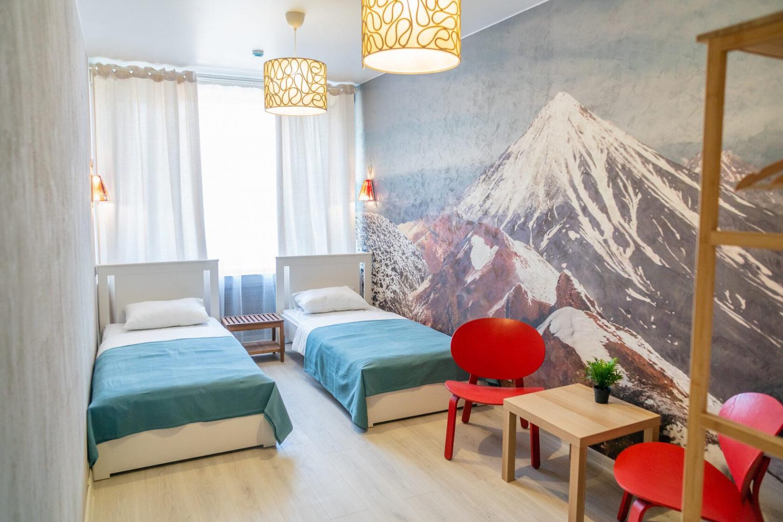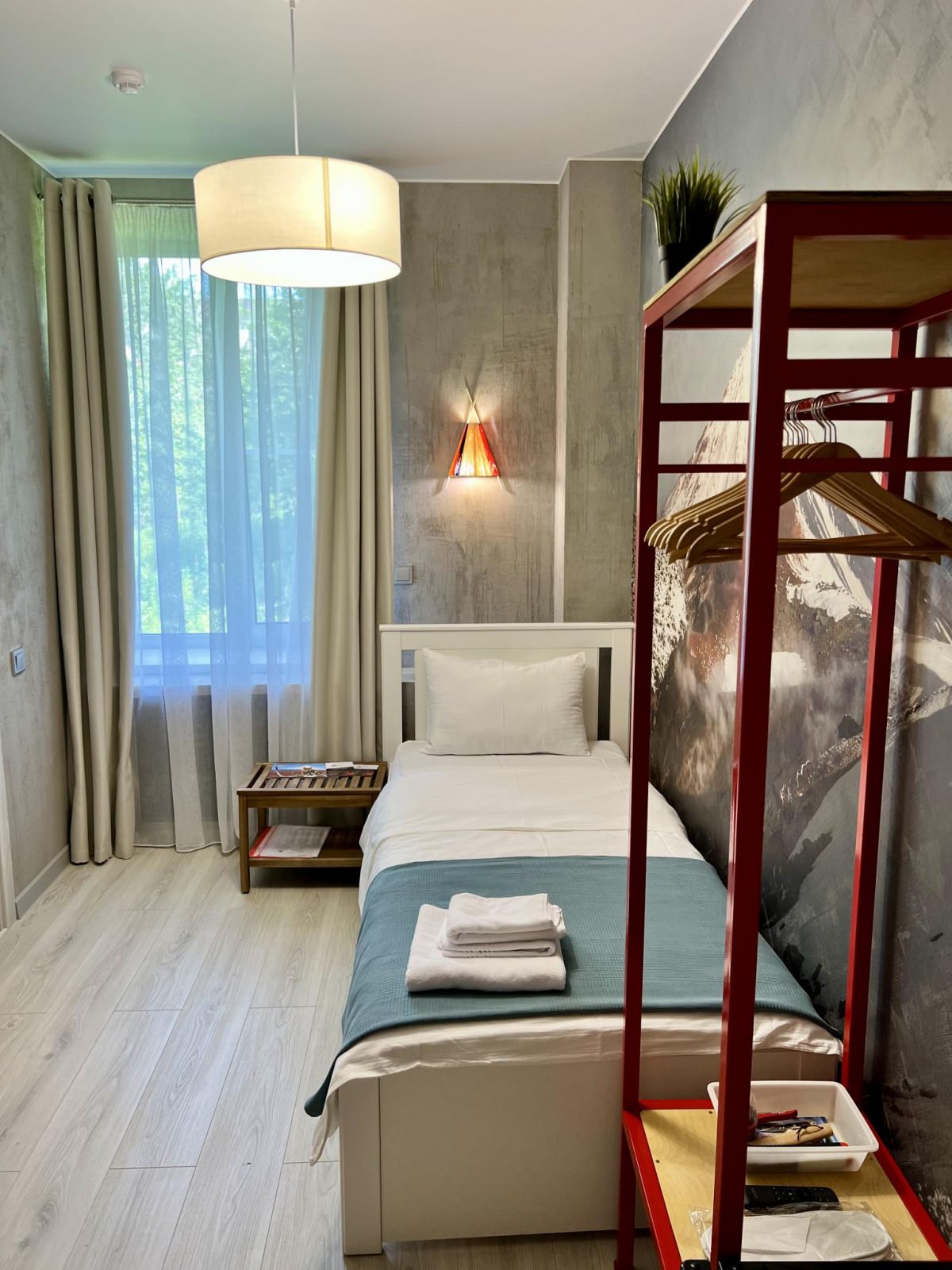 Однокомнатный двухместный номер с двуспальной кроватью и собственной душевой/туалетной комнатой. Номер оснащен холодильником, ТВ, шкафом, столом, стульями, тумбочками. В душевой комнату имеются гигиенические принадлежности, фен, полотенца.