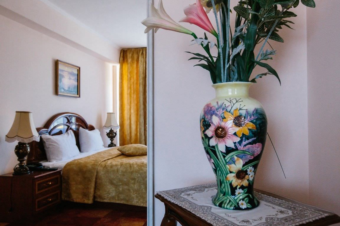 2 осн. места. 2 доп. места. Балкон. Мебель: вешалка, диван, зеркало, кресло, кровать двуспальная, прикроватные тумбочки, стол, столик журнальный, тумба, тумба багажная, шкаф. Оборудование: телевизор, телефон, холодильник. Санузел: с ванной, тапочки, туалетные принадлежности, фен, халат. Сервис: Wi-Fi бесплатно, room-сервис, смена полотенец, смена постельного белья, уборка номера.