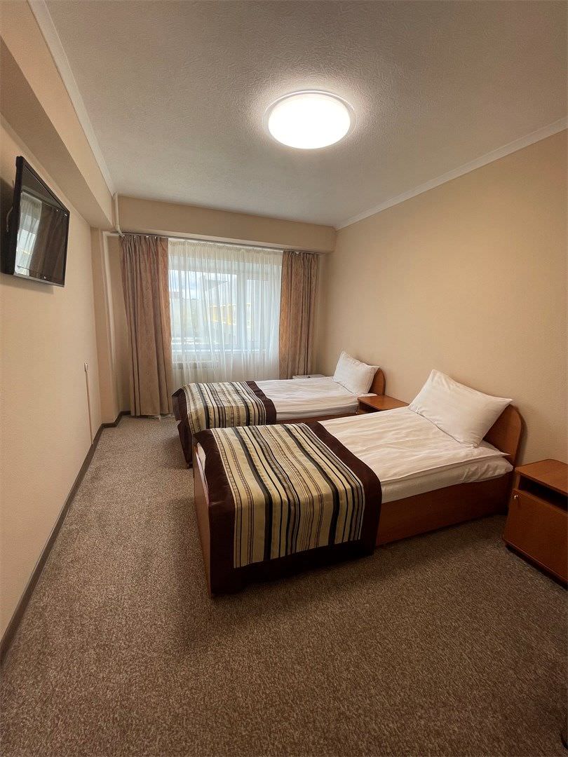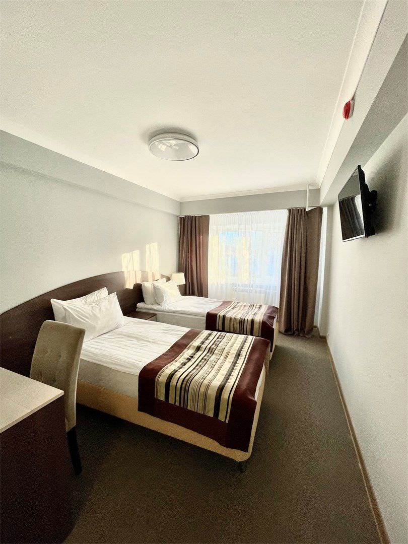 Площадь номера - 22 кв.м. 2 осн. места. 1 доп. место. Мебель: вешалка, зеркало, кровати односпальные, прикроватные тумбочки, стол, стулья, шкаф. Оборудование. Санузел: с душем, туалетные принадлежности. Сервис: Wi-Fi бесплатно, room-сервис, смена полотенец, смена постельного белья, уборка номера.
