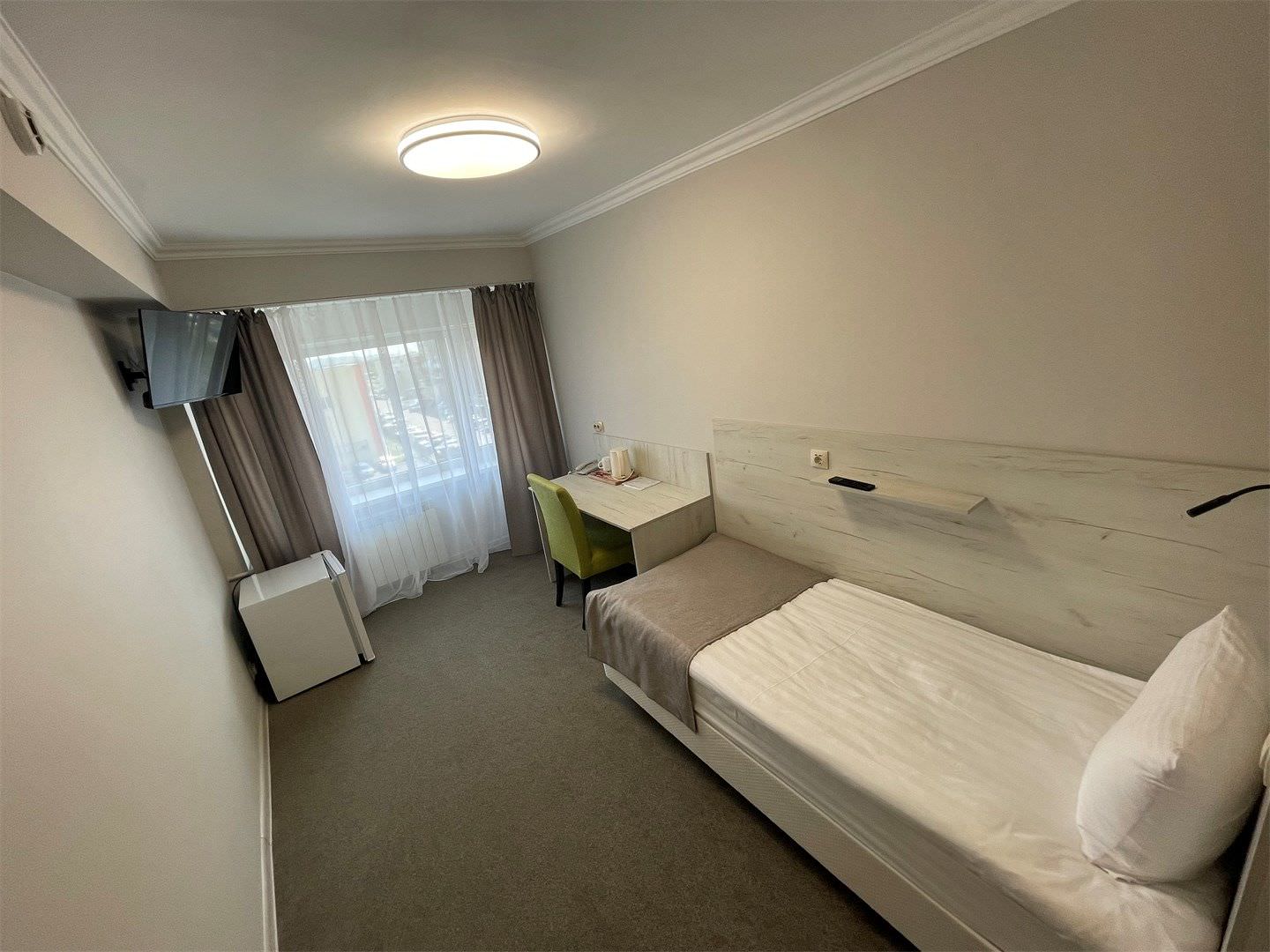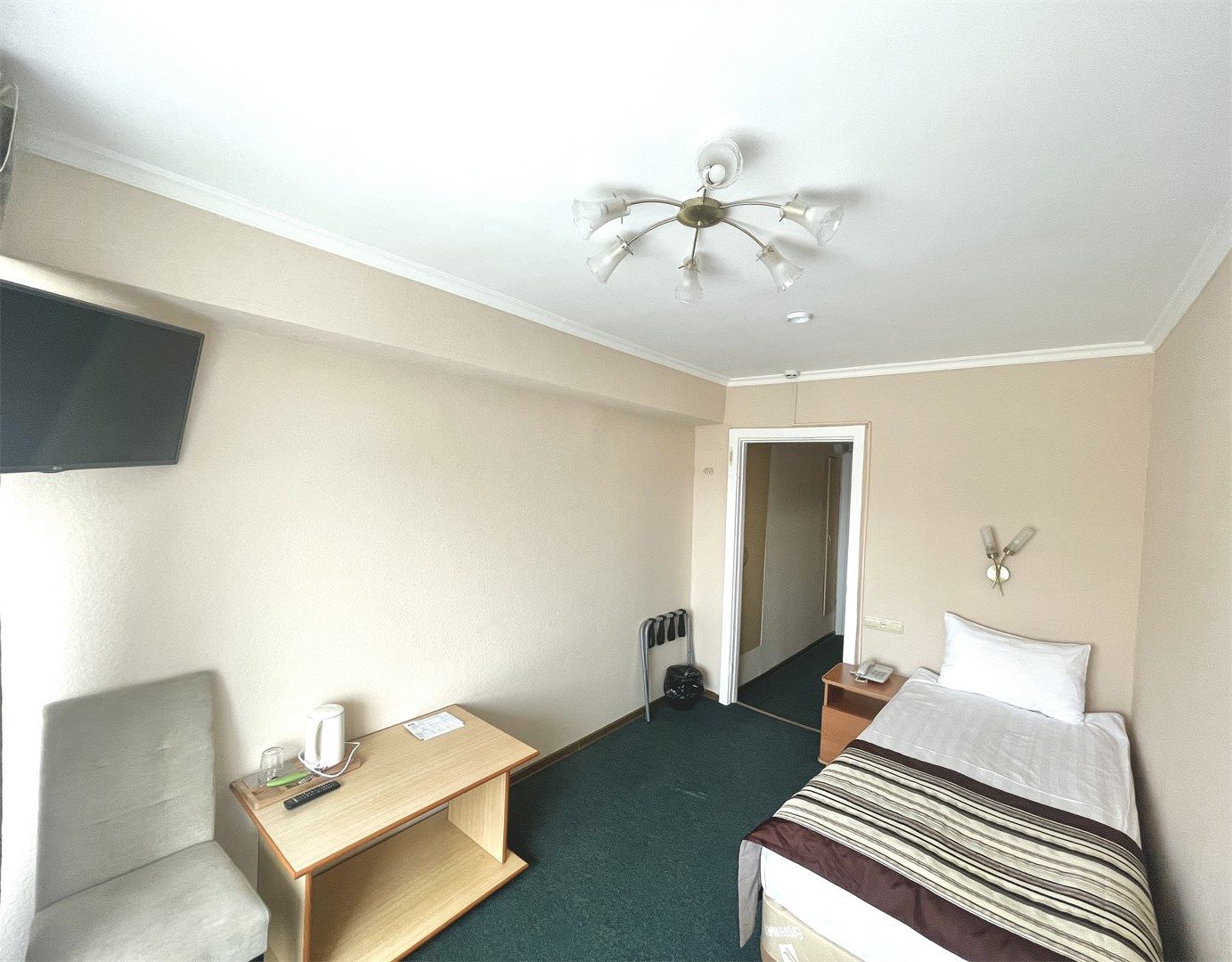 1 осн. место. Мебель: вешалка, зеркало, кресло, кровать односпальная, прикроватная тумбочка, стол, стулья, шкаф. Оборудование: телевизор, телефон, холодильник. Санузел: с душем, туалетные принадлежности. Сервис: Wi-Fi бесплатно, room-сервис, смена полотенец, смена постельного белья, уборка номера.