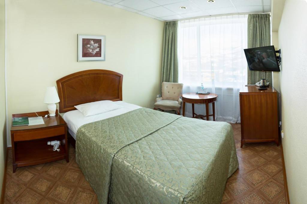 Однокомнатный номер располагает кроватью 1200*2000 см., имеется небольшой уголок для отдыха с кофейным столиком и стульями. Также предусмотрен гардероб, телевизор с кабельными каналами, телефон и холодильник. В ванной комнате находится ванна и санузел, гостям предоставляется персональный комплект полотенец и фен.