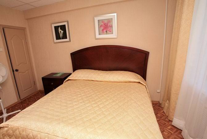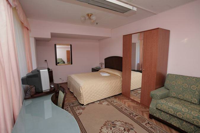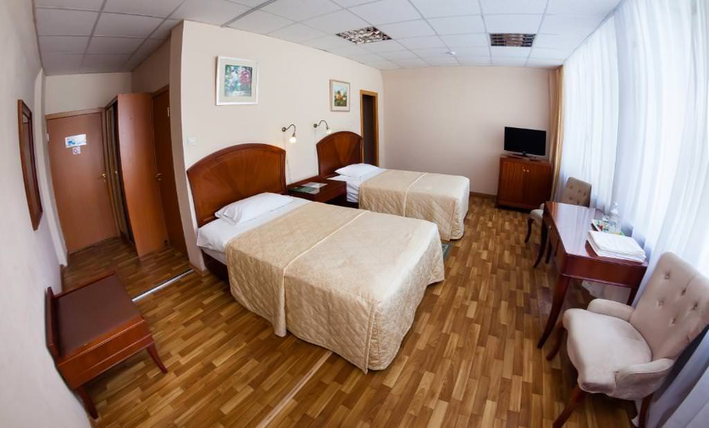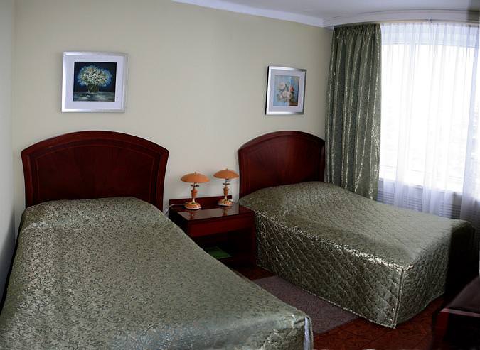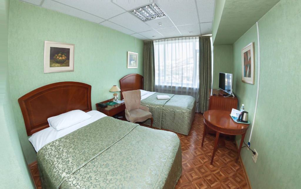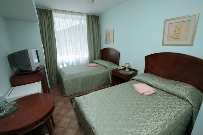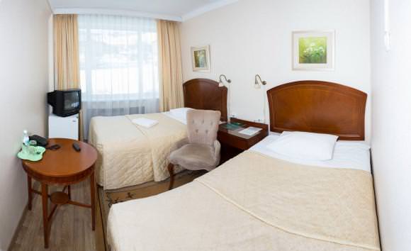 Однокомнатный номер с двумя раздельными кроватями 1200*2000 см. и прикроватными тумбами. В его оснащение входит стол, удобства для хранения багажа, цветной телевизор с кабельными каналами и телефон. Имеется холодильник. Ванная комната располагает ванной и санузлом, имеется персональный комплект полотенец для каждого гостя и фен.