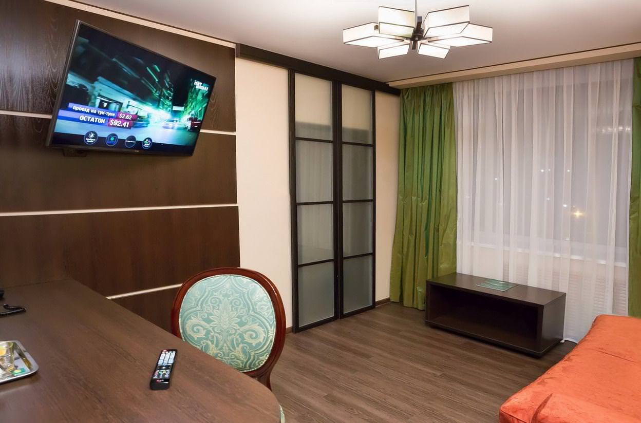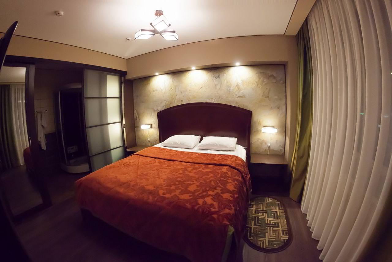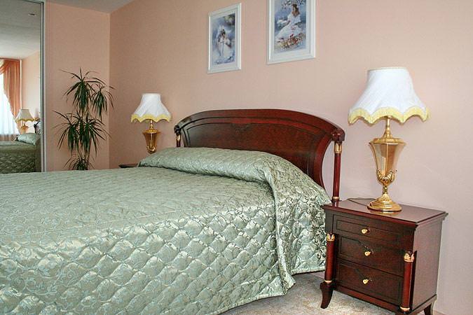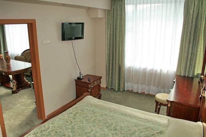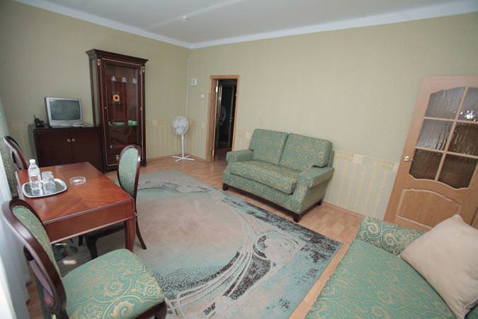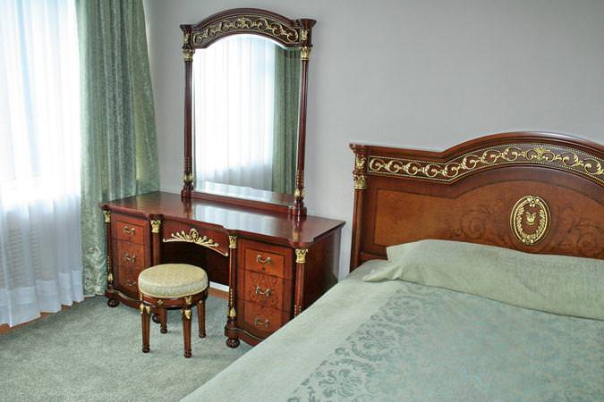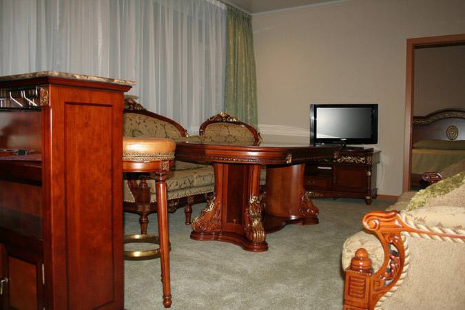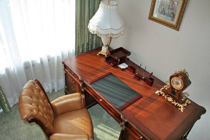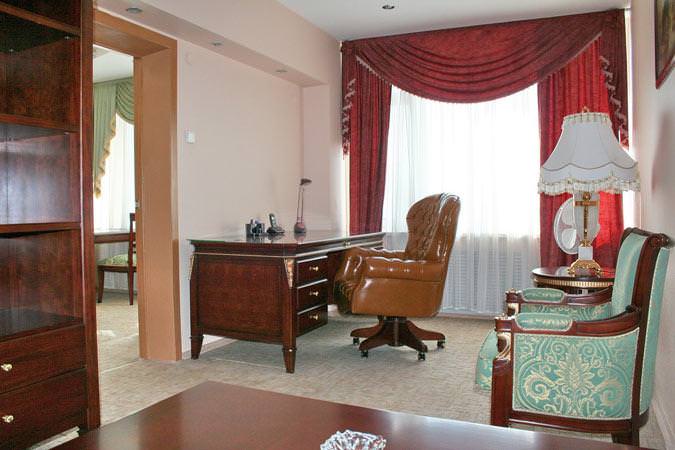 Номер высшей категории подходит для длительного проживания в городе и состоит из уютной спальни (двуспальная кровать), просторной гостиной и рабочего кабинета. Оформление помещений выполнено в классическом стиле, мебель изготовлена из темных пород дерева. В гостиной имеется обеденный стол, стулья, а также мягкая мебель и журнальный столик. Предусмотрен цветной телевизор, мини-бар, телефон, индивидуальный сейф, предоставляется чайник и комплект посуды. Уединенный кабинет оснащен эргономичным столом и креслом, есть зона для переговоров. Ванная комната располагает гидромассажной ванной-джакузи, есть биде и санузел. Гостям предоставляются полотенца, все необходимые туалетные принадлежности, халаты и тапочки.