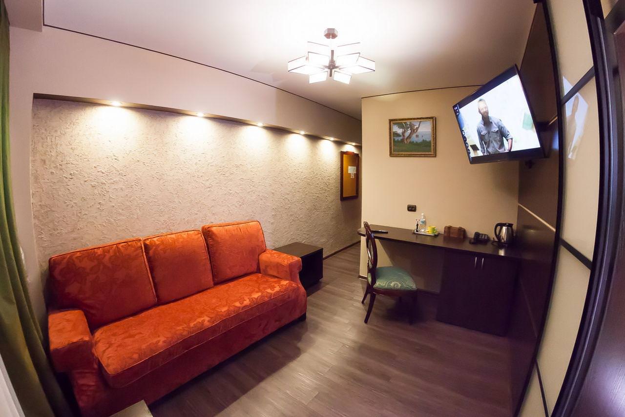 Однокомнатный номер расположен рядом с кафе, располагает кроватью 1200*2000 см., имеется небольшой уголок для отдыха с кофейным столиком и стульями. Также предусмотрен гардероб, телевизор с кабельными каналами, телефон и холодильник. В ванной комнате находится ванна и санузел, гостям предоставляется персональный комплект полотенец и фен