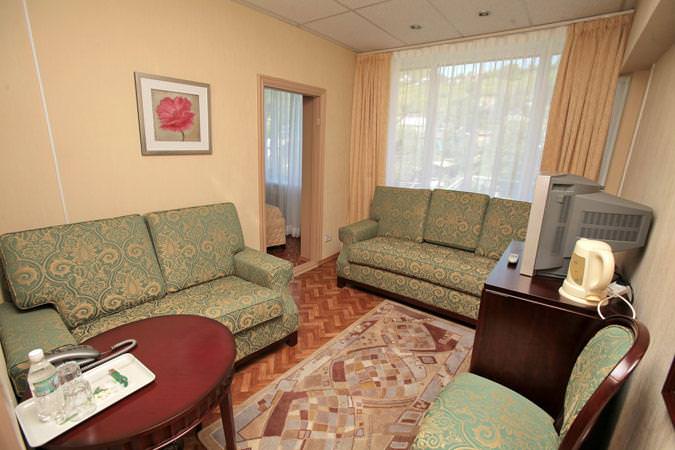 Двухкомнатные номера данной категории состоят из спальни и гостиной. В зависимости от пожеланий гостей спальня может быть оснащена широкой двуспальной или двумя раздельными односпальными кроватями с прикроватными тумбами, имеется вместительный гардероб и вентилятор. В гостиной находится мягкая мебель, рабочее место, журнальный столик, а также цветной телевизор и телефон. Имеется холодильник, мини-бар, электрочайник и посуда. Ванная комната располагает ванной и санузлом, гостям предоставляются туалетные принадлежности, полотенца, фен, халаты и тапочки.