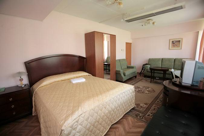Двухкомнатный номер состоит из спальни и гостиной. Спальня оснащена широкой двуспальной кроватью с прикроватными тумбами, имеется вместительный гардероб, телевизор и вентилятор. В гостиной находится мягкая мебель, рабочее место, журнальный столик, а также цветной телевизор и телефон. Имеется холодильник, мини-бар, электрочайник и посуда. Ванная комната располагает ванной и санузлом, гостям предоставляются туалетные принадлежности.