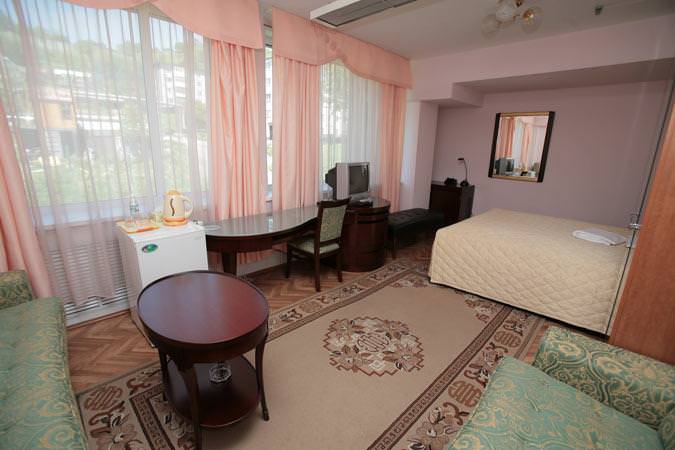 Улучшенный номер располагает двумя раздельными кроватями 1200*2000 см., к услугам гостей — вместительный гардероб, удобный стол и стулья, имеется кабельное телевидение, телефон с междугородним выходом и холодильник. В ванной комнате с ванной и санузлом гости найдут комплект полотенец, набор туалетных принадлежностей, халаты, тапочки и фен.
