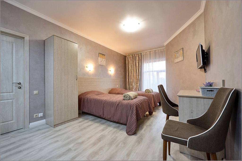 Двухместный номер с красивым видом из окна. В апартаментах есть все необходимое для комфортного проживания, оборудованная кухня, обеденная зона, две односпальные кровати, телевизор, холодильник, микроволновая печь, собственная ванная комната с душем.