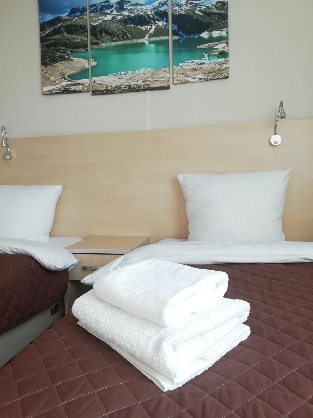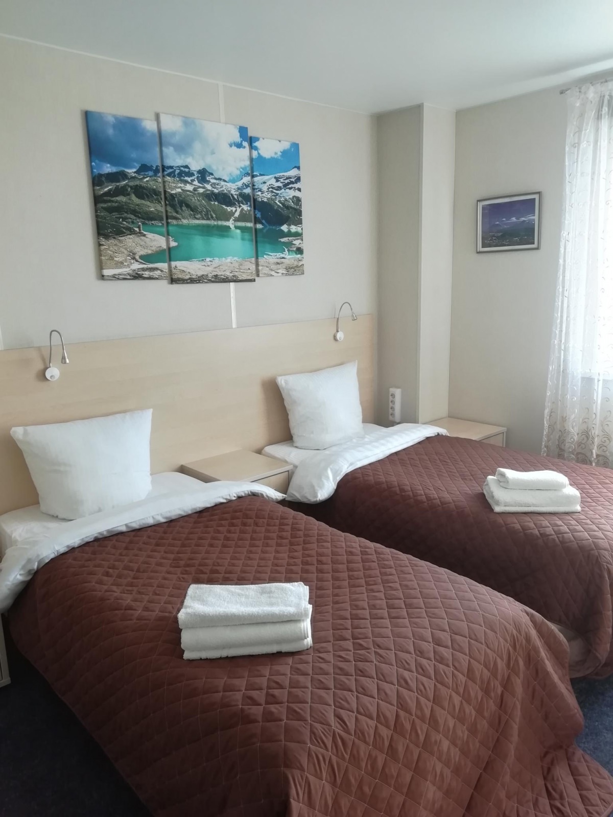 Стандартный номер с видом на "скалу" с одной жилой комнатой и санузлом. В номере: двуспальная кровать или две односпальных, шкаф для одежды и белья, прихожая, письменный стол и стул, отопление, сейф, LED телевизор 32, цифровое эфирное ТВ, фен, холодильник (мини-бар), чайник, чайный набор. В стоимость номера включен Завтрак по типу "Шведского стола".