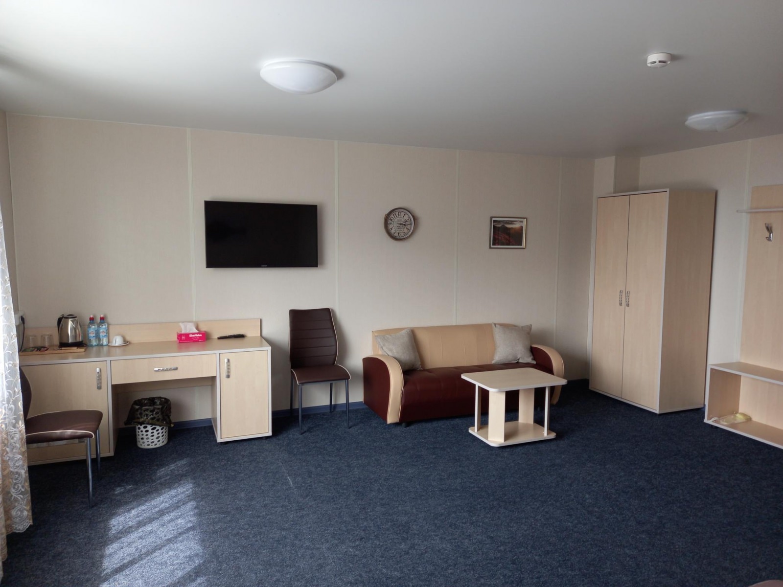 Улучшенный номер с видом на "Бухту" с одной жилой комнатой и санузлом. Двуспальная кровать или две односпальных, диван, журнальный стол, шкаф для одежды и белья, прихожая, письменный стол и стул, отопление, сейф, LED телевизор 40, цифровое эфирное ТВ, фен, холодильник (мини-бар), чайник, чайный набор. В стоимость номера включен Завтрак по типу "Шведского стола".