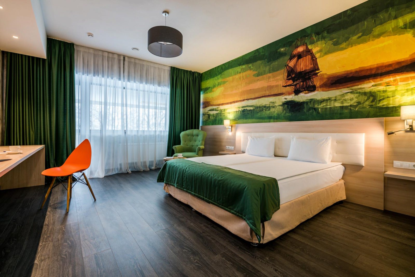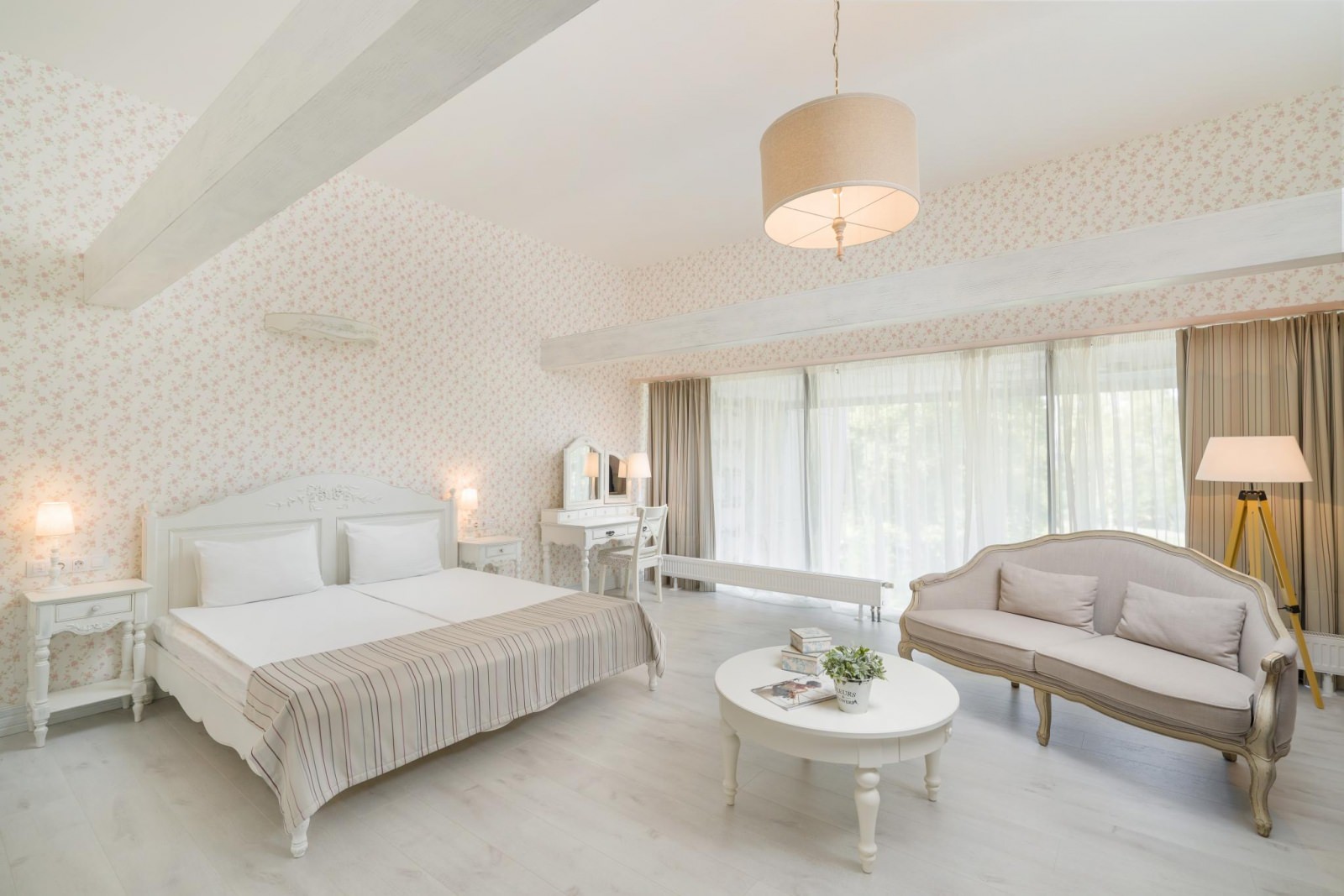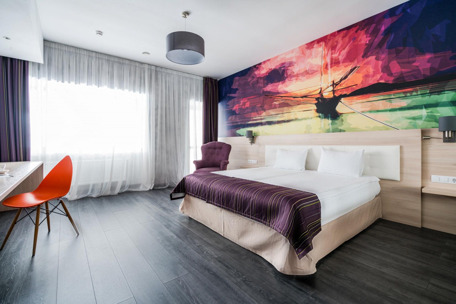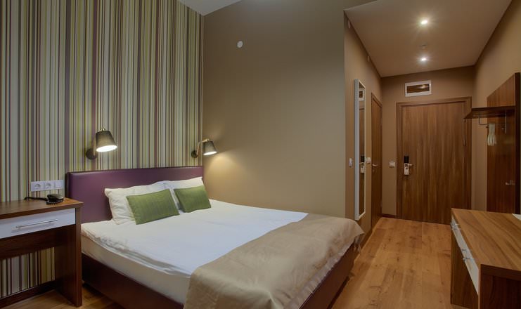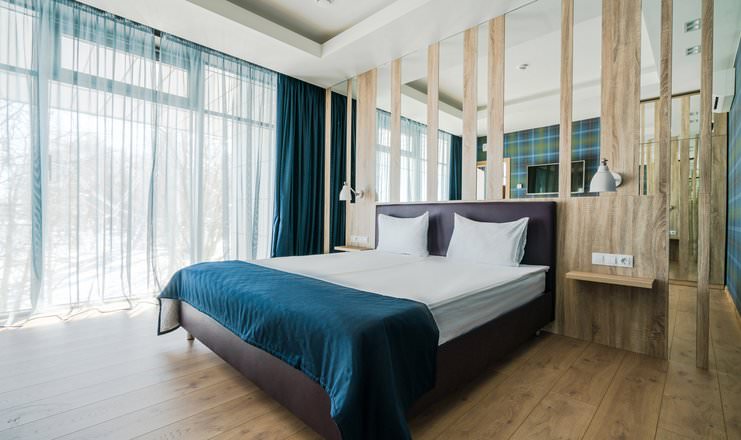Просторный и светлый номер с двуспальной кроватью имеет площадь 45 кв.м. Возможно предоставление спального места под запрос.