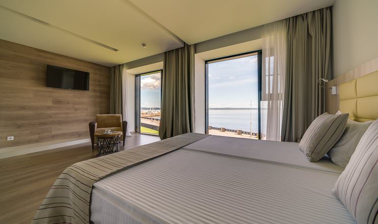 Номер площадью 70 кв. м с большой двуспальной кроватью. Из окон открывается панорамный вид на озеро.