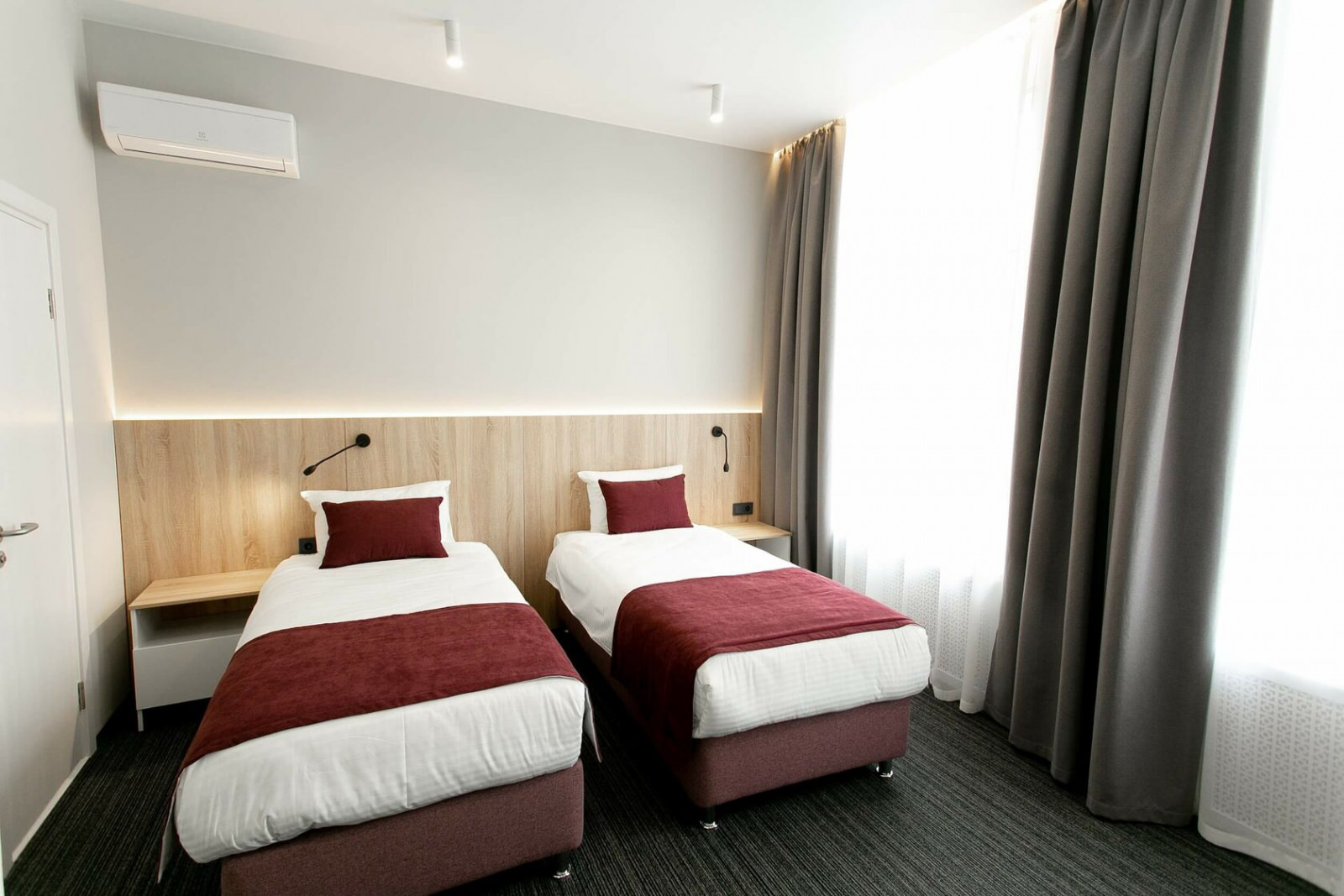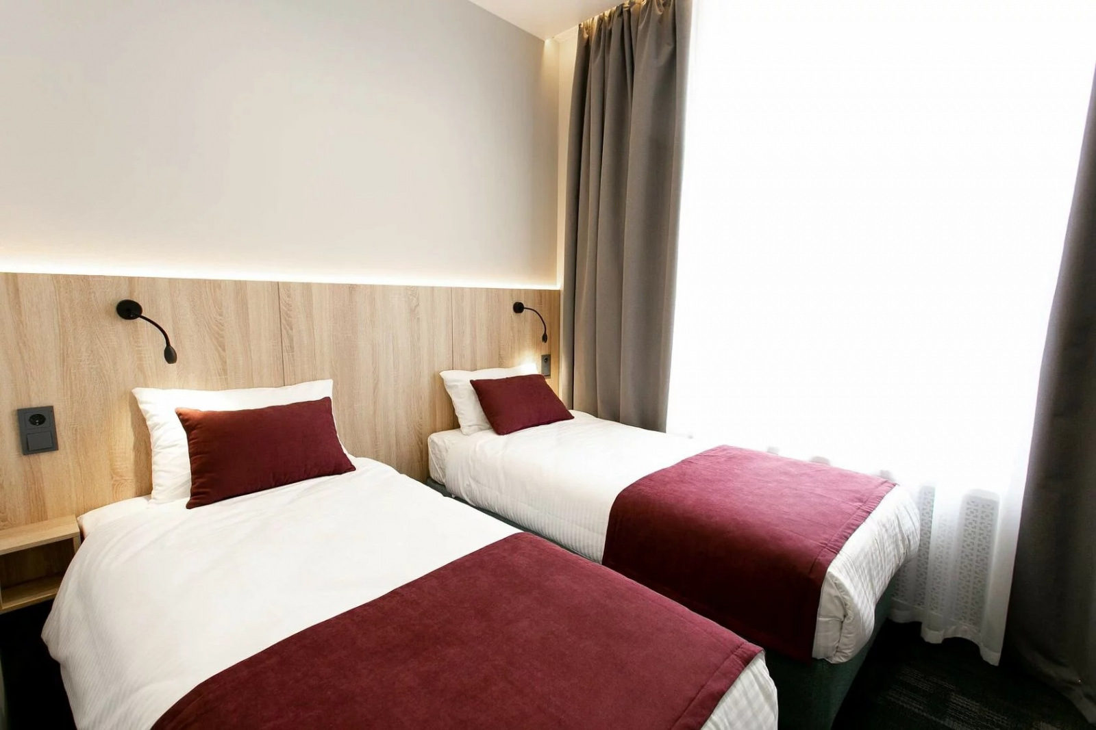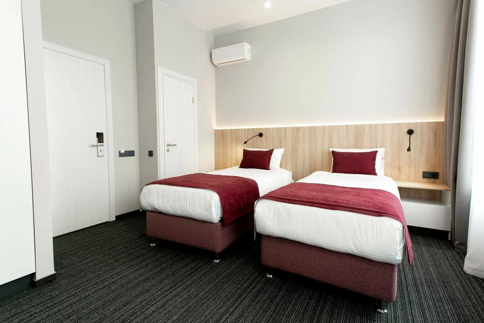 Площадь номера - 13,5 кв.м. 2 осн. места. Мебель: вешалка, зеркало, кровати односпальные /одна двуспальная кровать (box spring), прикроватные тумбочки, стол, стул, шкаф. Оборудование: кондиционер, телевизор, холодильник, чайная станция. Санузел: с душем, тапочки, туалетные принадлежности, фен. Сервис: Wi-Fi бесплатно, room-сервис, смена полотенец, смена постельного белья, уборка номера.