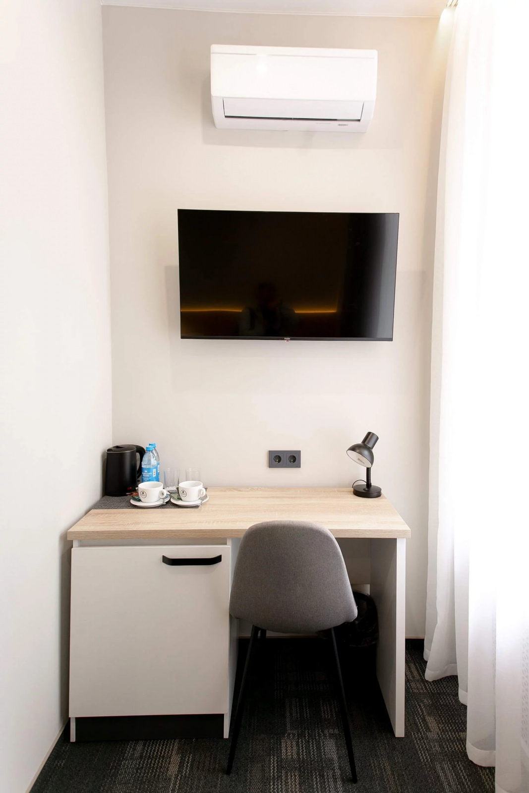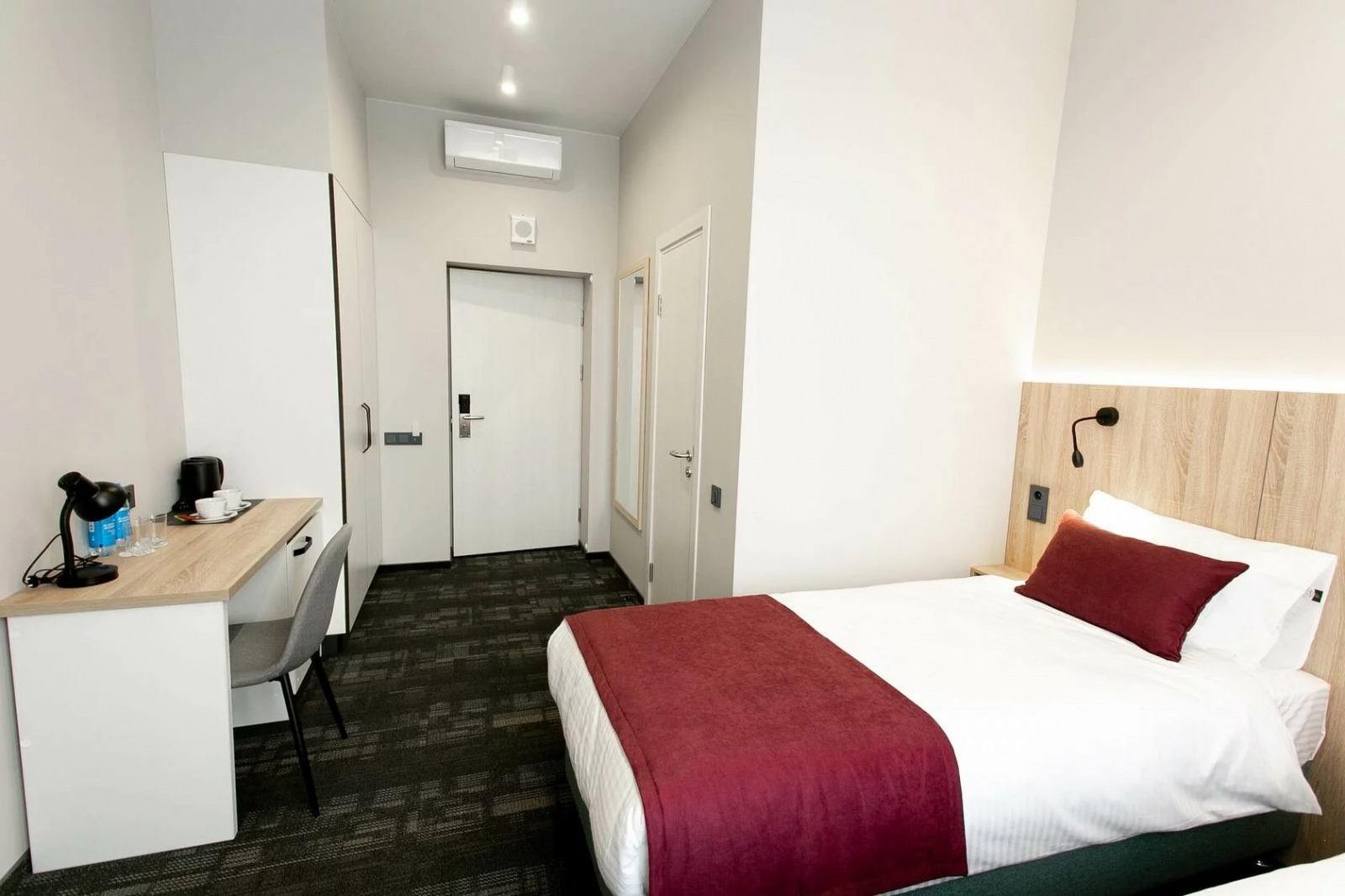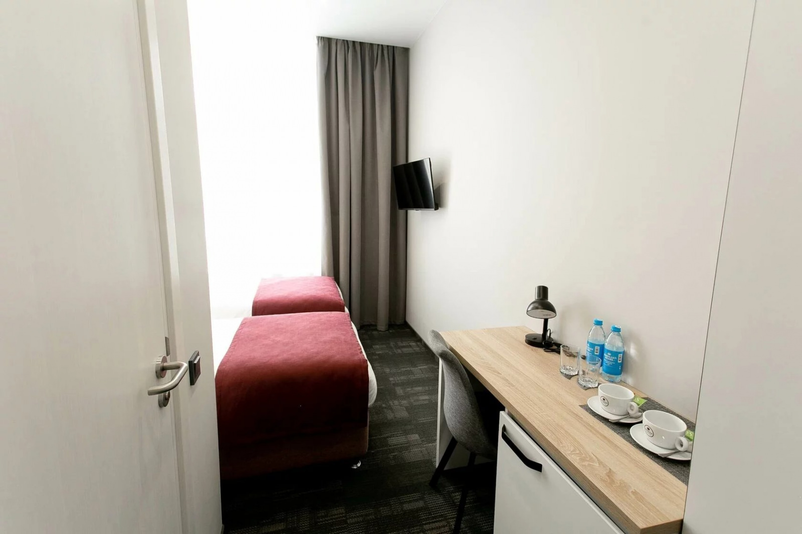 Площадь номера - 13,5 кв.м. 2 осн. места. Мебель: вешалка, зеркало, кровати односпальные /одна двуспальная кровать (box spring), прикроватные тумбочки, стол, стул, шкаф. Оборудование: кондиционер, телевизор, холодильник, чайная станция. Санузел: с душем, тапочки, туалетные принадлежности, фен. Сервис: Wi-Fi бесплатно, room-сервис, смена полотенец, смена постельного белья, уборка номера.