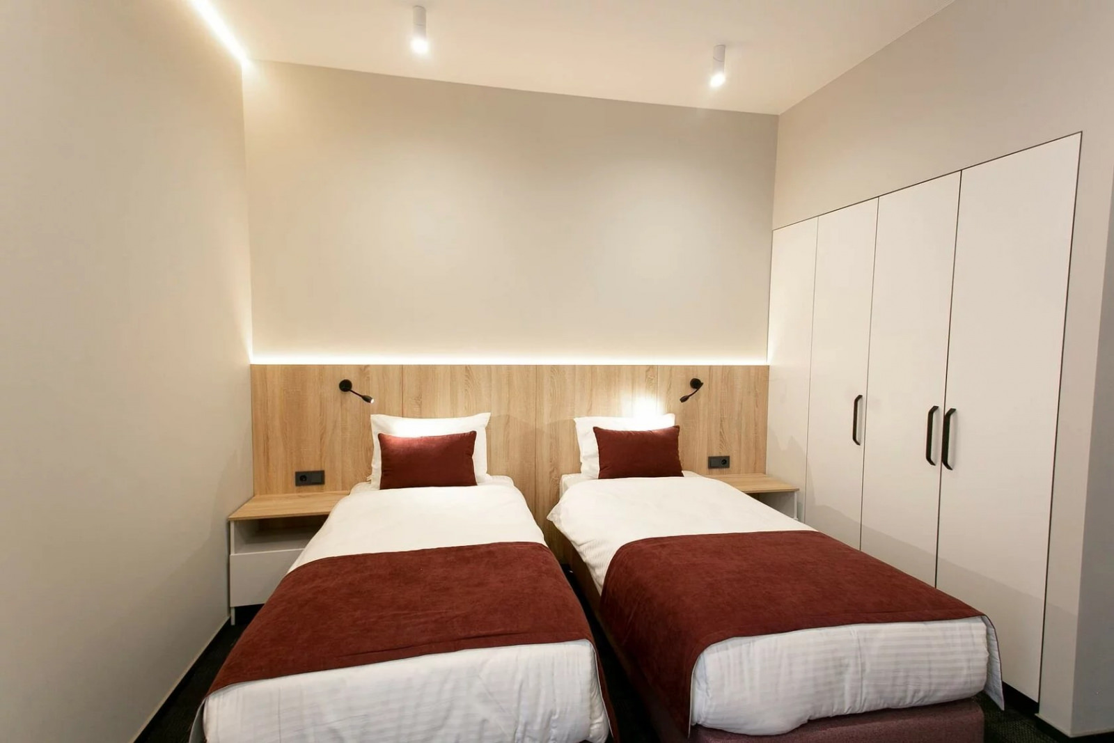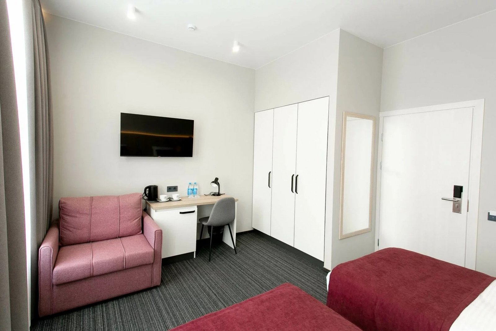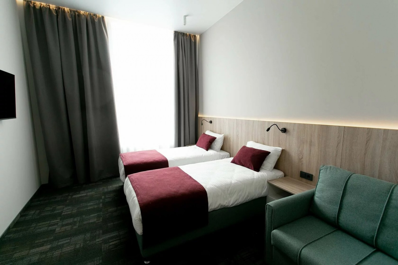 Площадь номера - 20 кв.м. 2 осн. места. 1 доп. место. Мебель: вешалка, зеркало, кресло-кровать, кровати односпальные /одна двуспальная кровать (box spring), прикроватные тумбочки, стол, стул, шкаф. Оборудование: кондиционер, телевизор, холодильник, чайная станция. Санузел: с душем, тапочки, туалетные принадлежности, фен. Сервис: Wi-Fi бесплатно, room-сервис, смена полотенец, смена постельного белья, уборка номера.