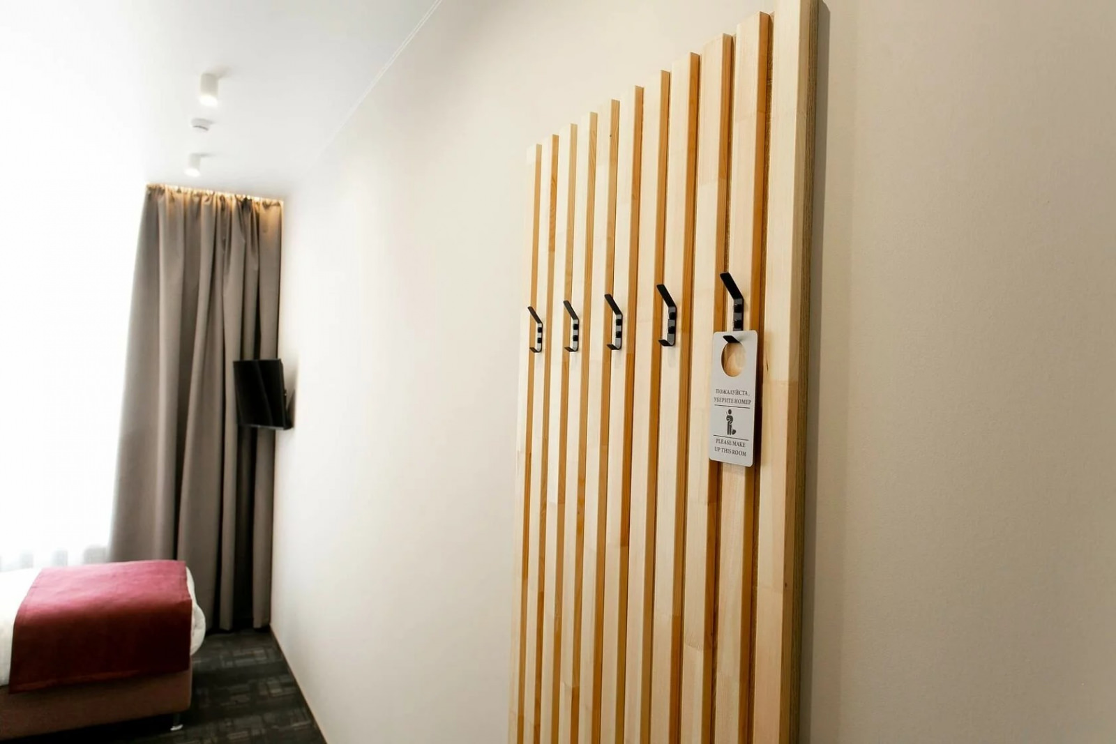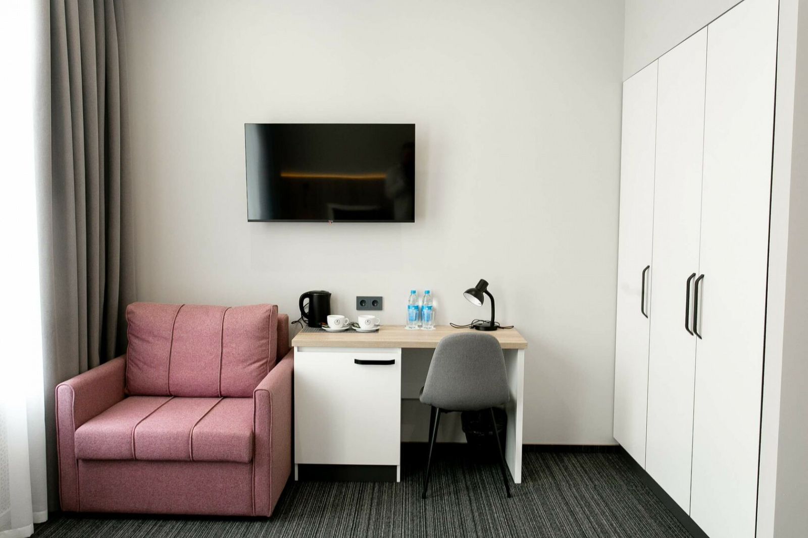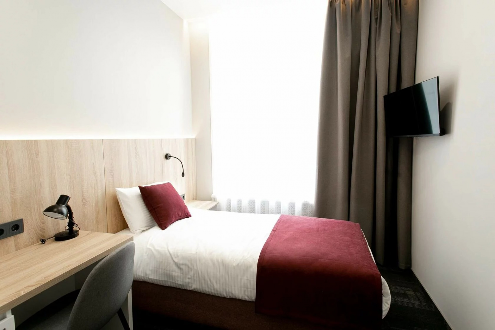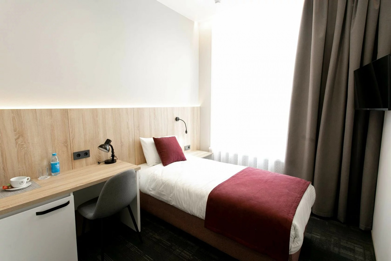 Площадь номера - 11 кв.м. 1 осн. место. Мебель: вешалка, зеркало, кровать односпальная, прикроватная тумбочка, стол, стул, шкаф. Оборудование: кондиционер, телевизор, холодильник, чайная станция. Санузел: с душем, тапочки, туалетные принадлежности, фен. Сервис: Wi-Fi бесплатно, room-сервис, смена полотенец, смена постельного белья, уборка номера.