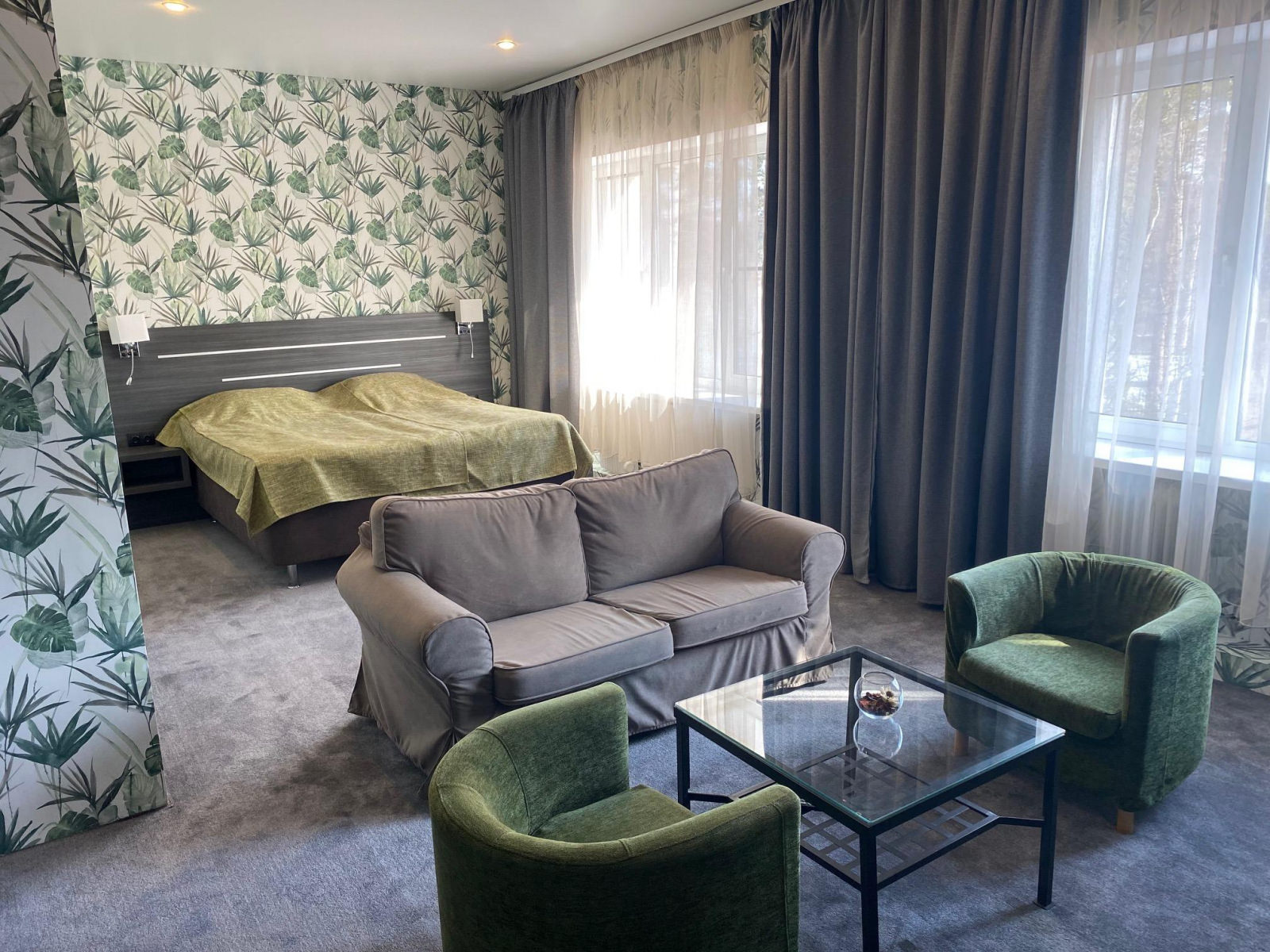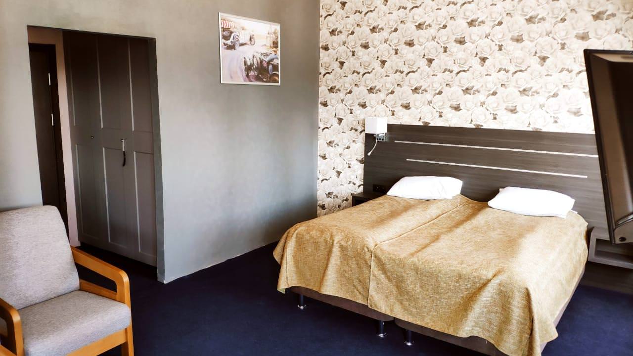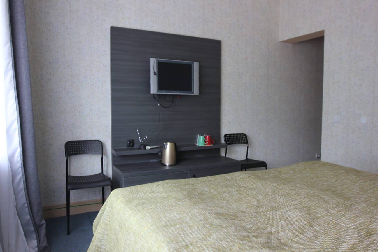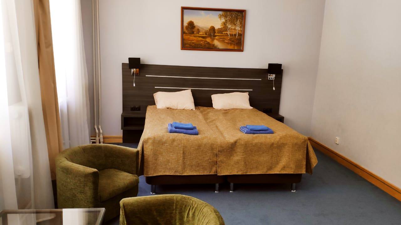 Уютный номер с отдельной ванной комнатой и туалетом. Номер оборудован всем необходимым: двуспальная кровать, кресла, холодильник, прикроватная тумба, телевизор с цифровым телевидением.