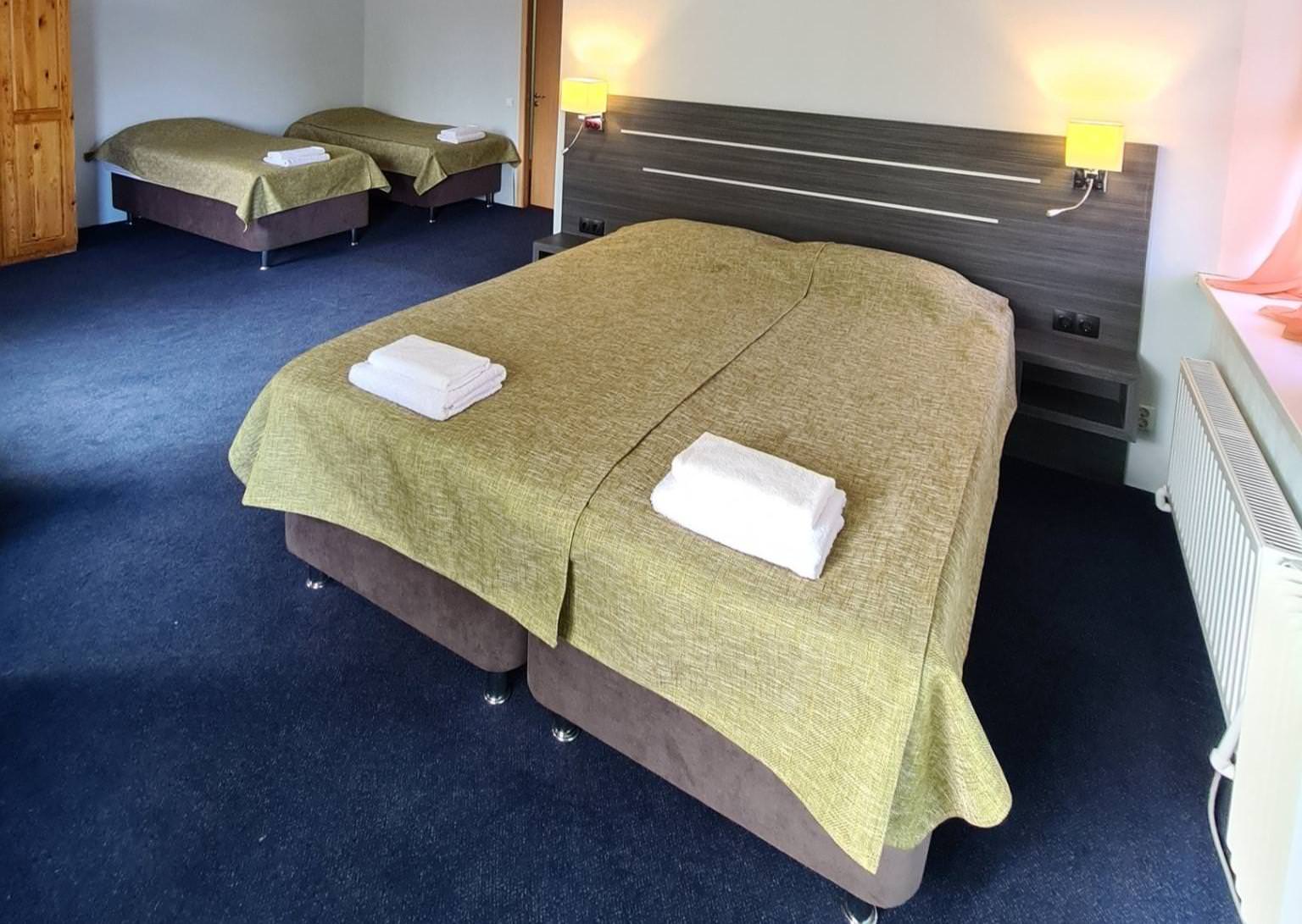 Уютный номер с отдельной ванной комнатой и туалетом. Номер оборудован всем необходимым: 3 кровати, кресло, холодильник, чайник, прикроватная тумба, шкаф, стол,